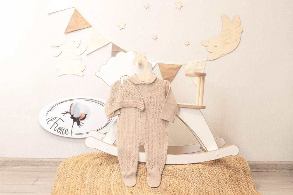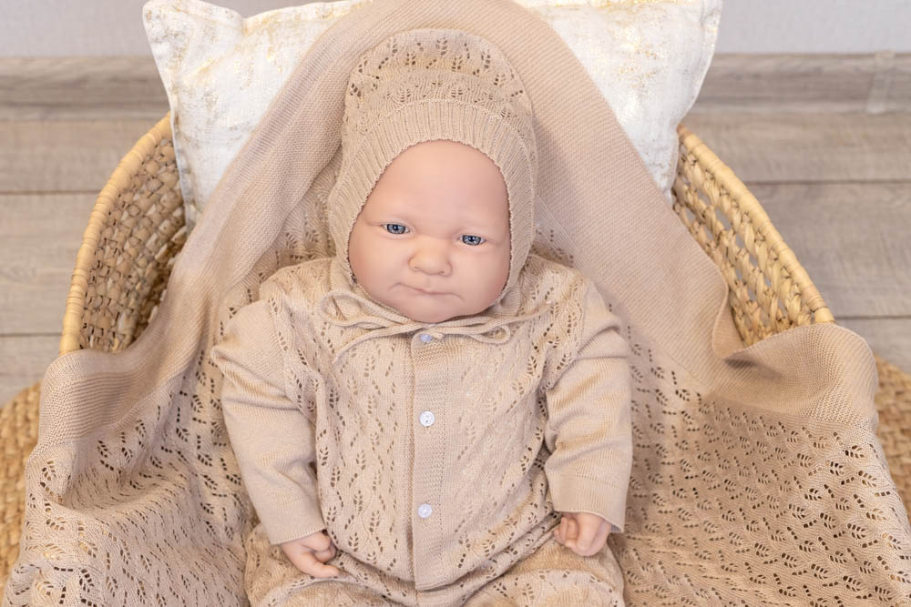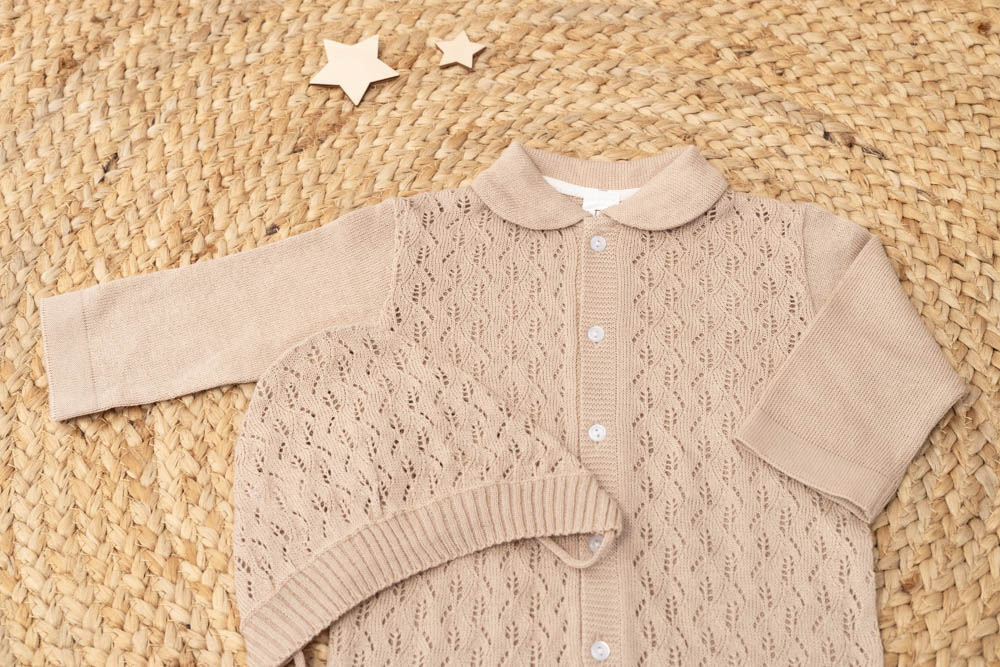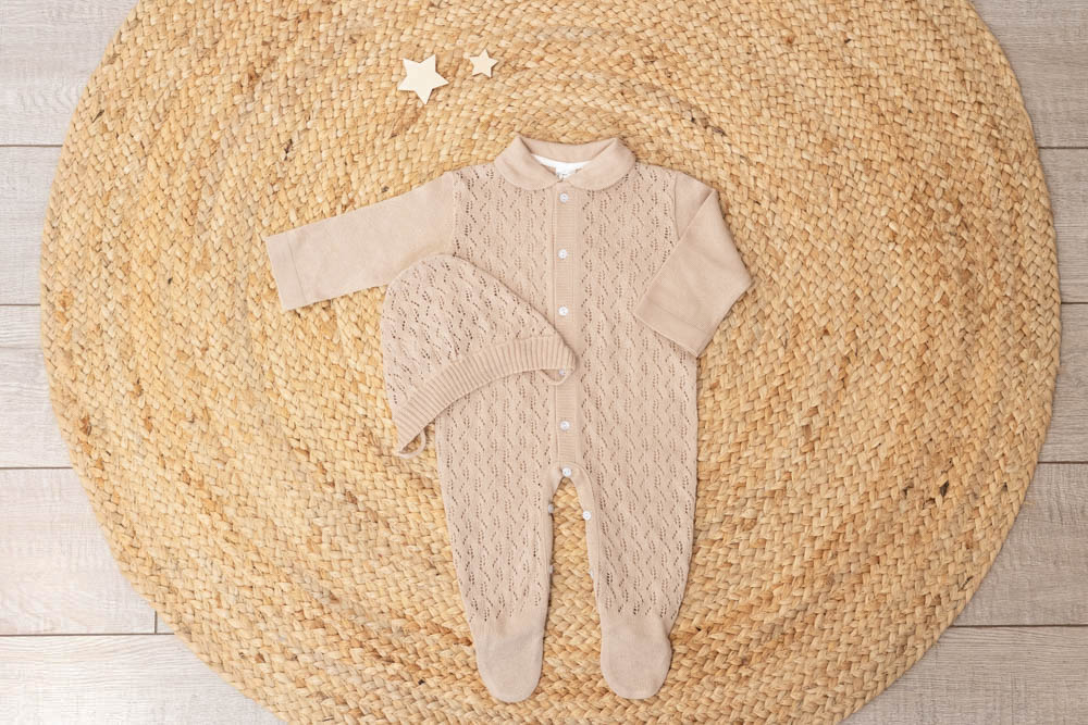 Легкий воздушный комбинезон с чепчиком в оригинальном ажурном плетении подойдет, как для выписки малыша, так и для повседневного использования на прогулке.