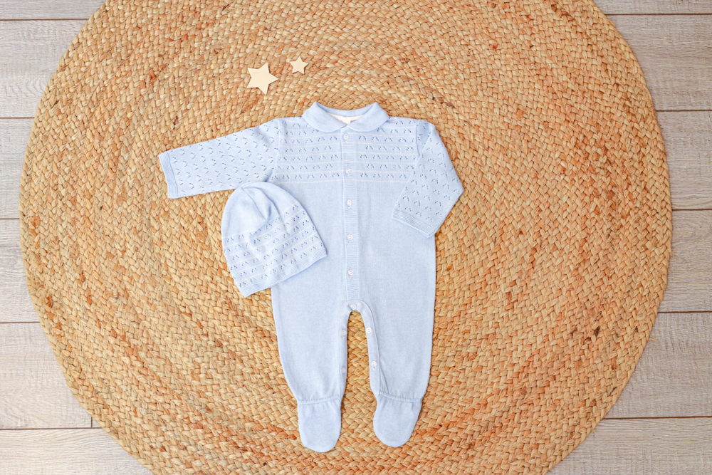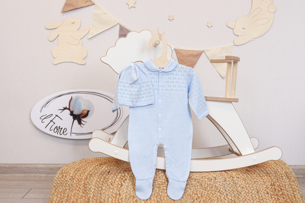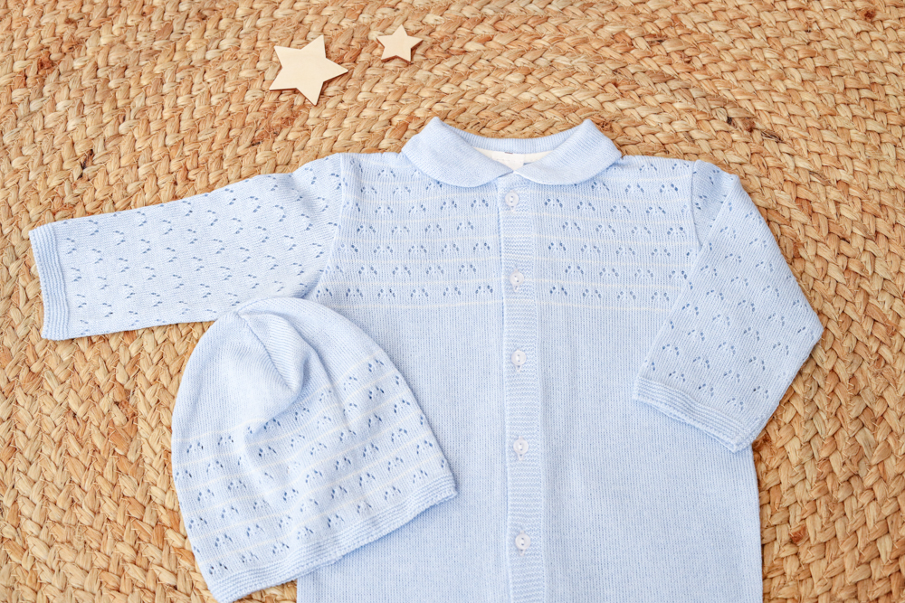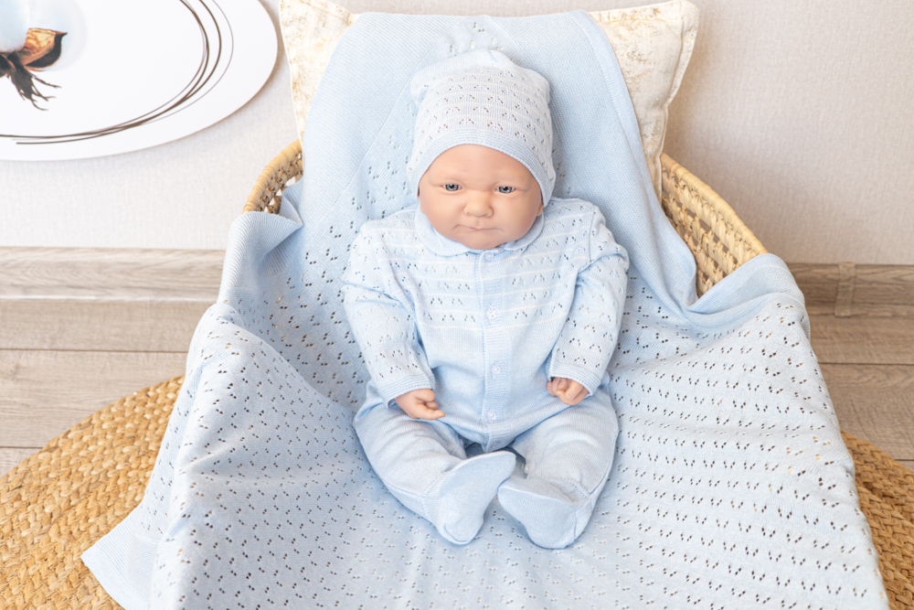 Тонкий невесомый комбинезон с шапочкой в оригинальном ажурном плетении подойдет, как для выписки малыша, так и для повседневного использования на прогулке.