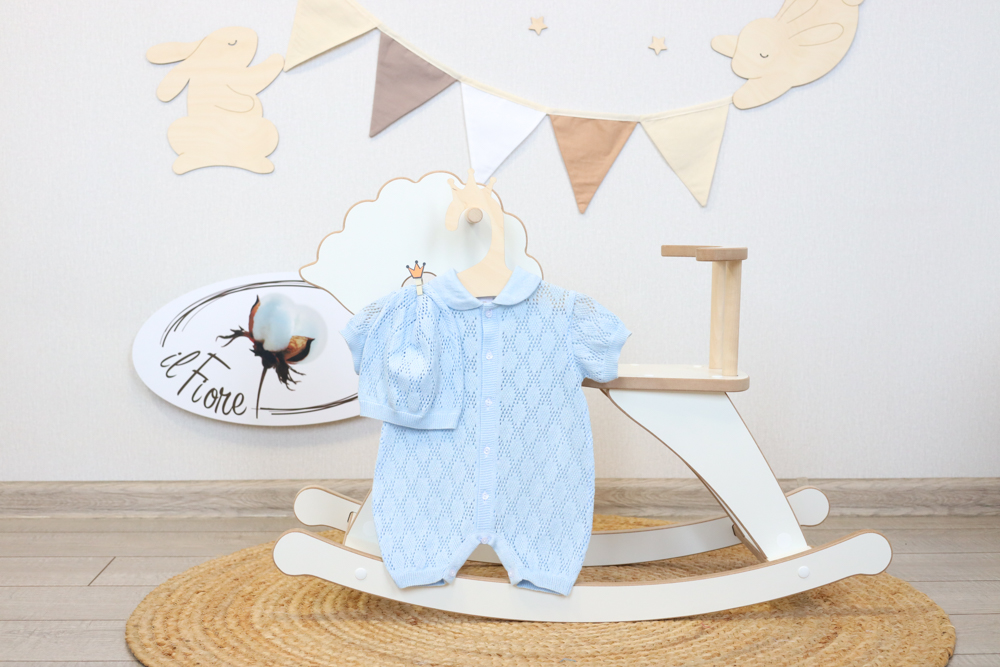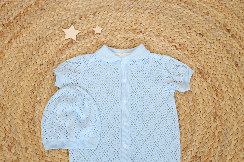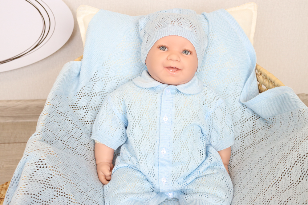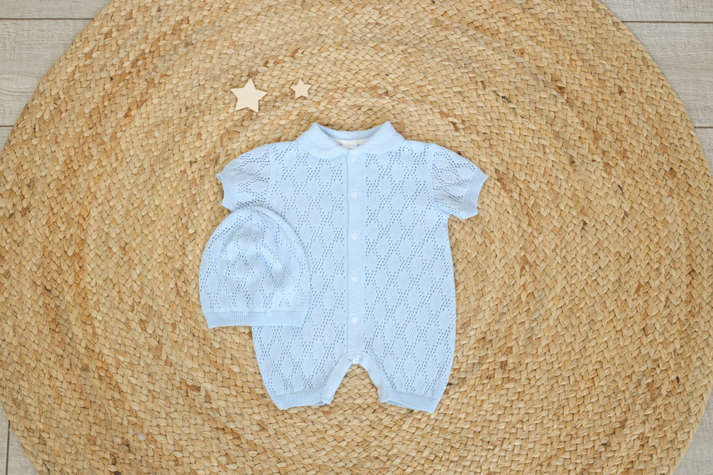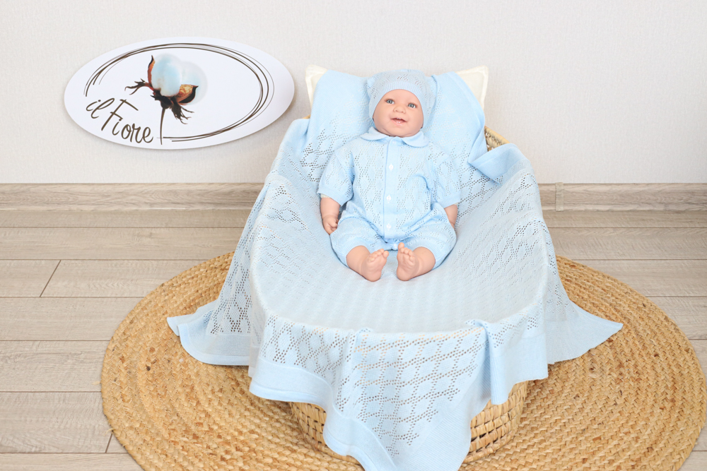 Тонкий невесомый комплект в оригинальном ажурном плетении подойдет, как для выписки малыша, так и для повседневного использования.