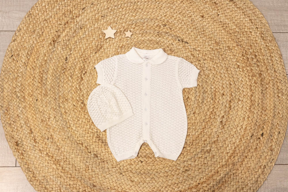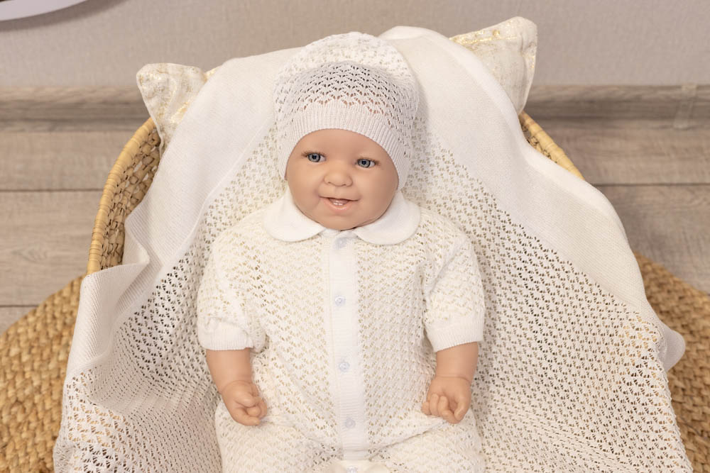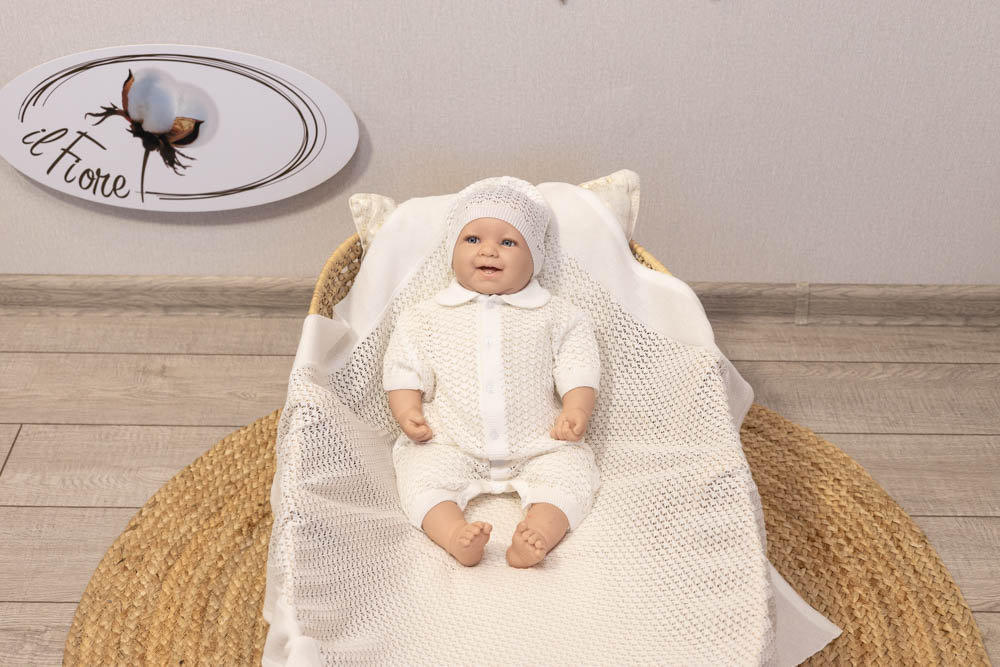 Тонкий невесомый комплект в оригинальном ажурном плетении подойдет, как для выписки малыша, так и для повседневного использования.
