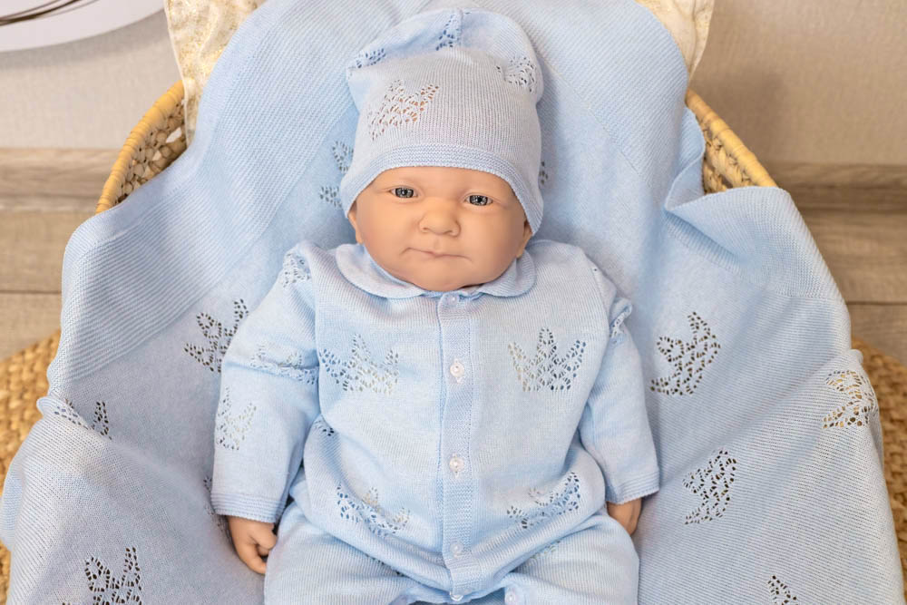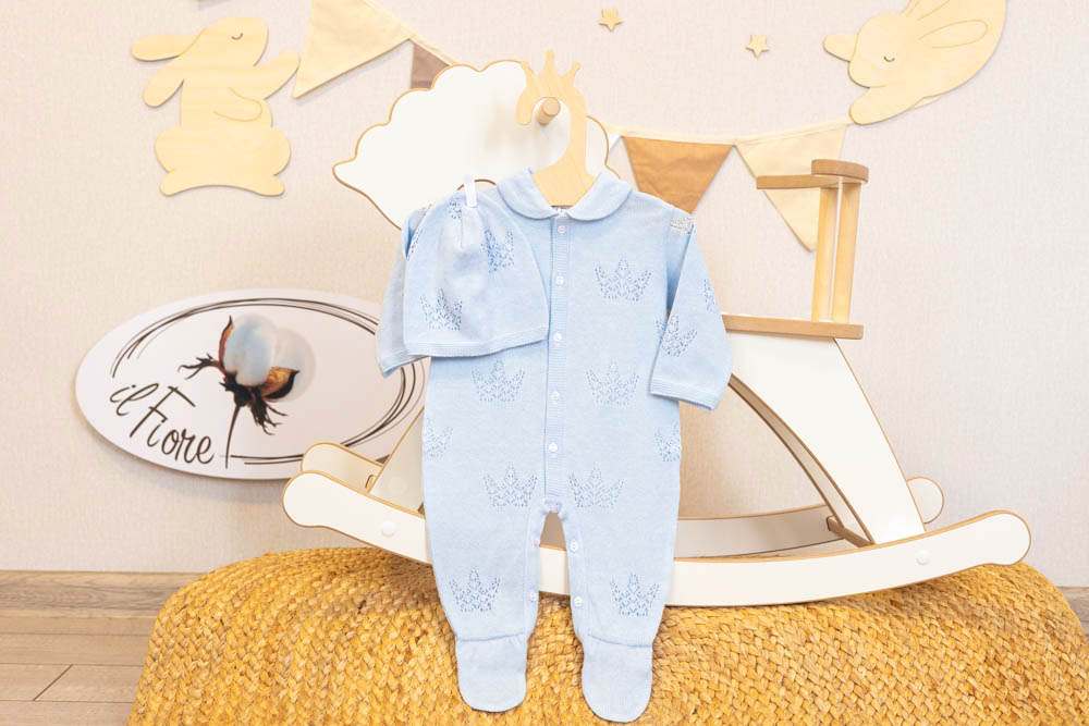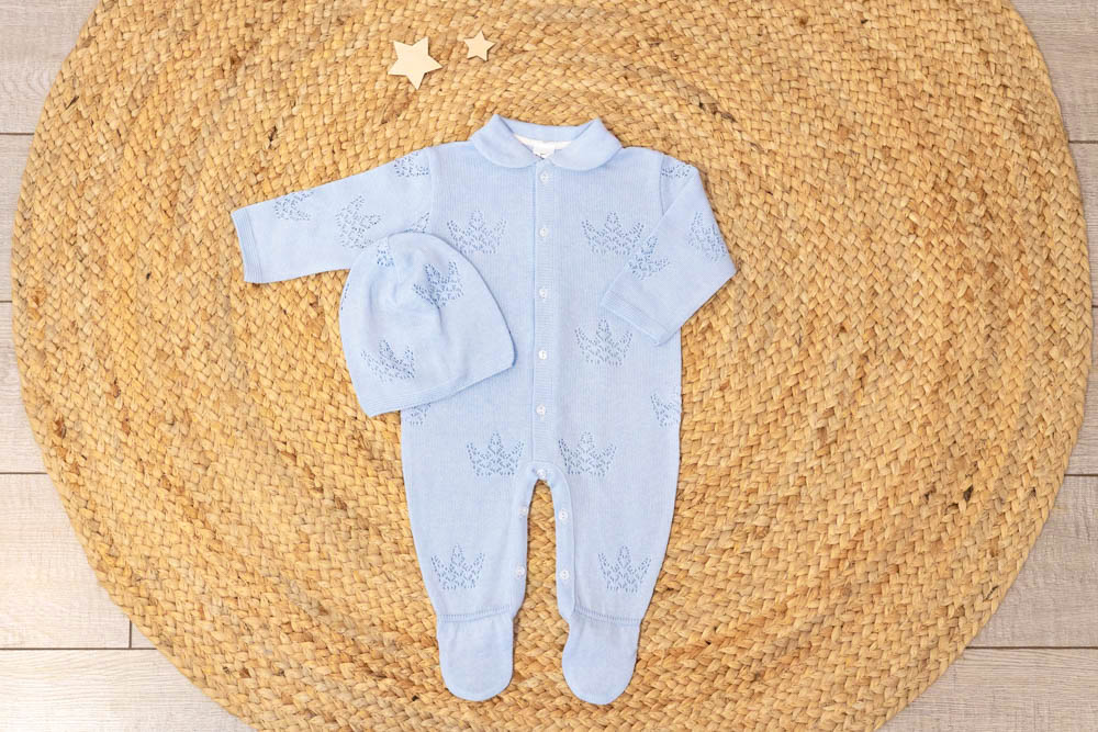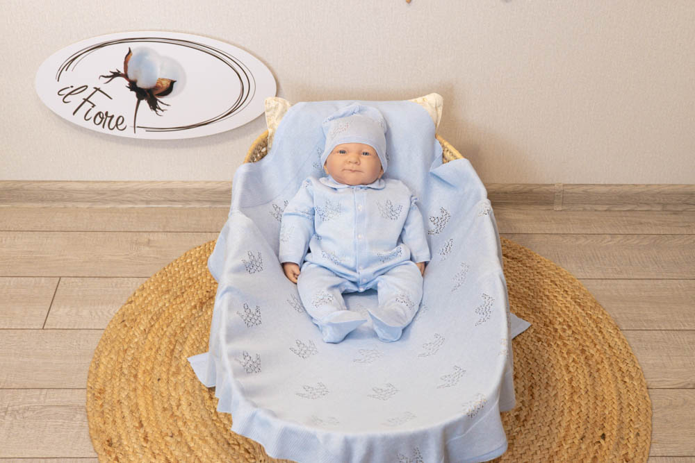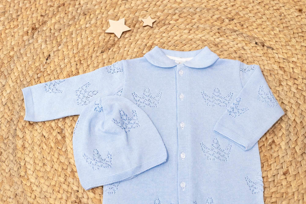 Легкий ажурный комплект с роскошными узорами в виде корон подойдет, как для торжественной выписки малыша, так и для повседневного использования.