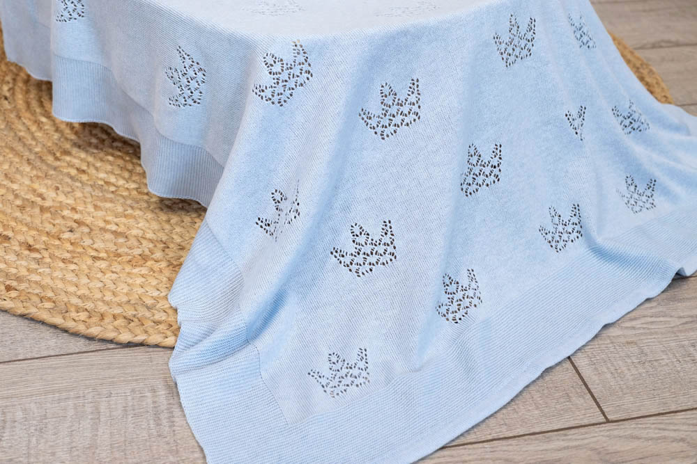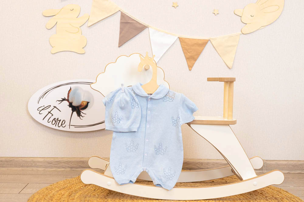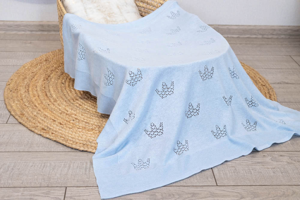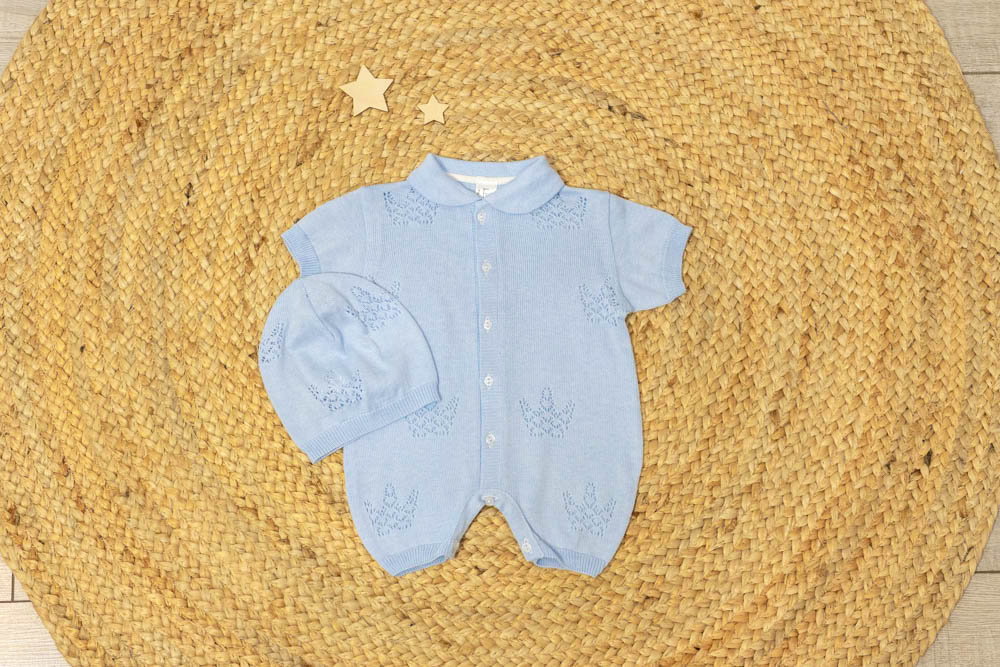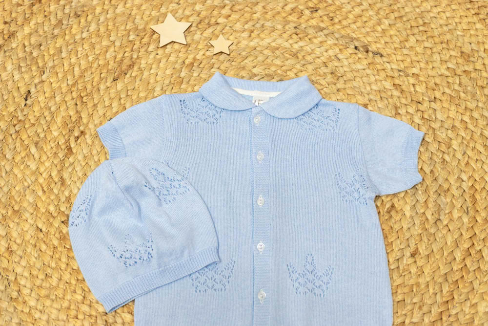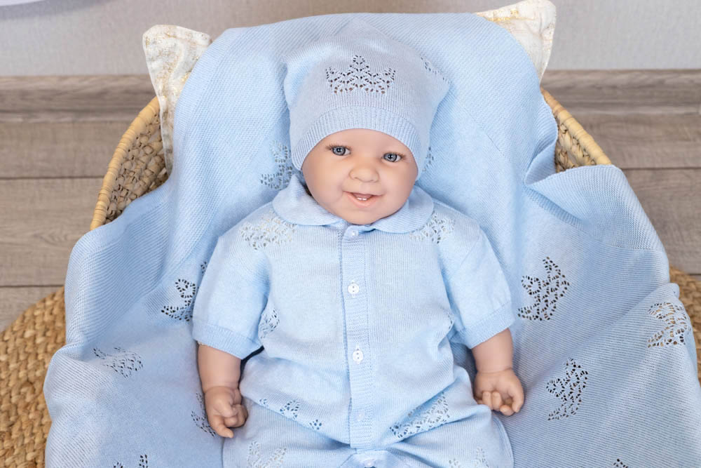 Легкий ажурный комплект с роскошными узорами в виде корон подойдет, как для торжественной выписки малыша, так и для повседневного использования.
