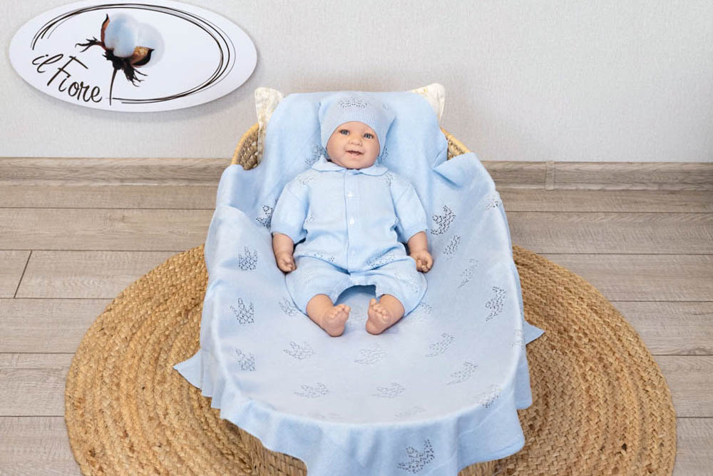 Комплект состоит из пледа, песочник и шапочки и представлен в нежной нюдовой гамме цветов.