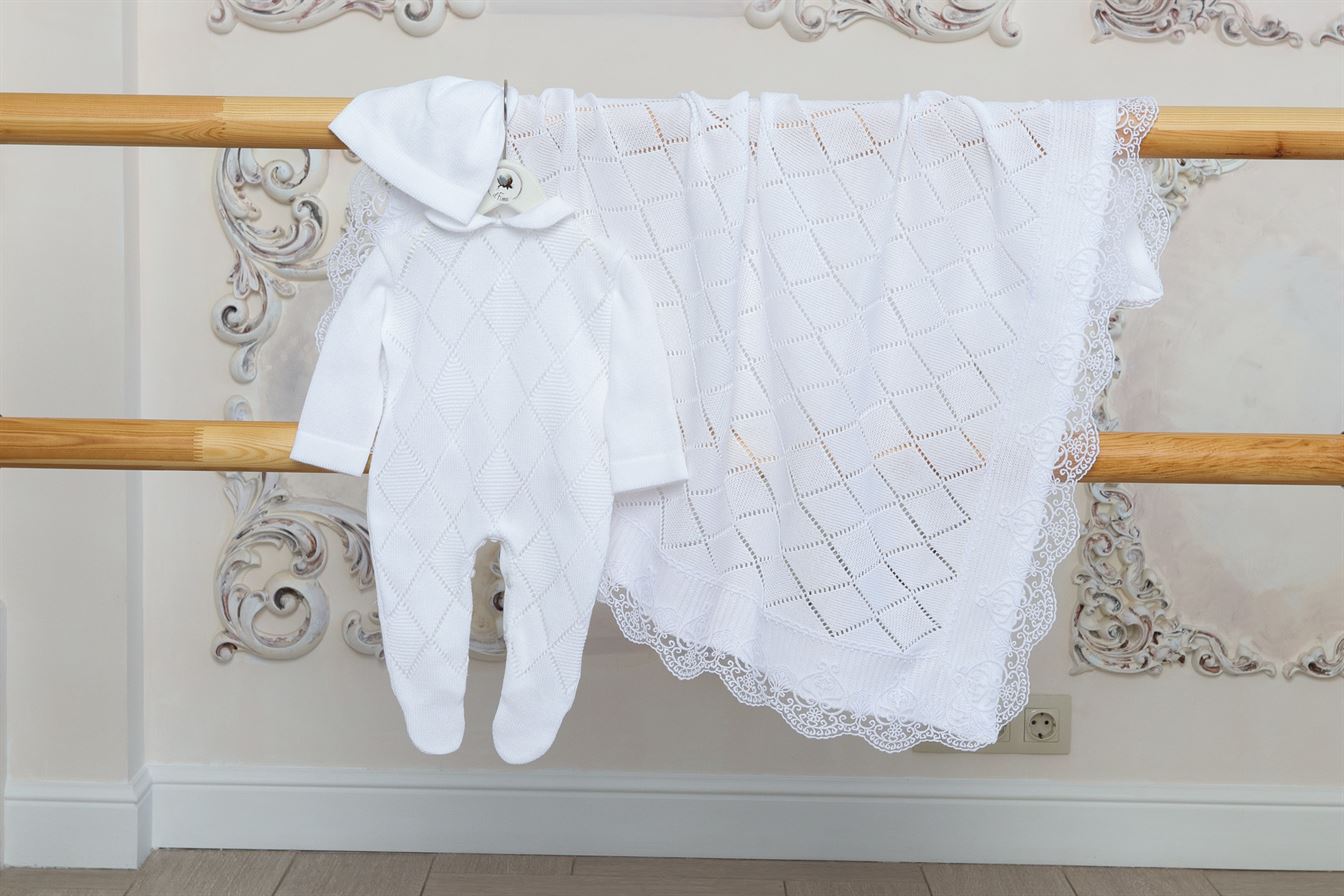 Состоит из трех предметов: плед, комбинезон и шапочка.
