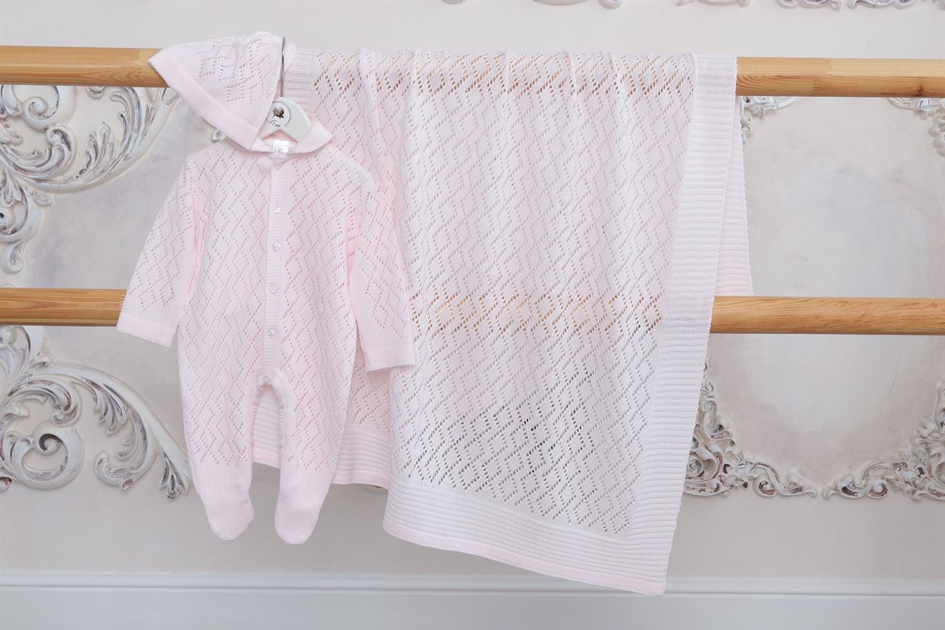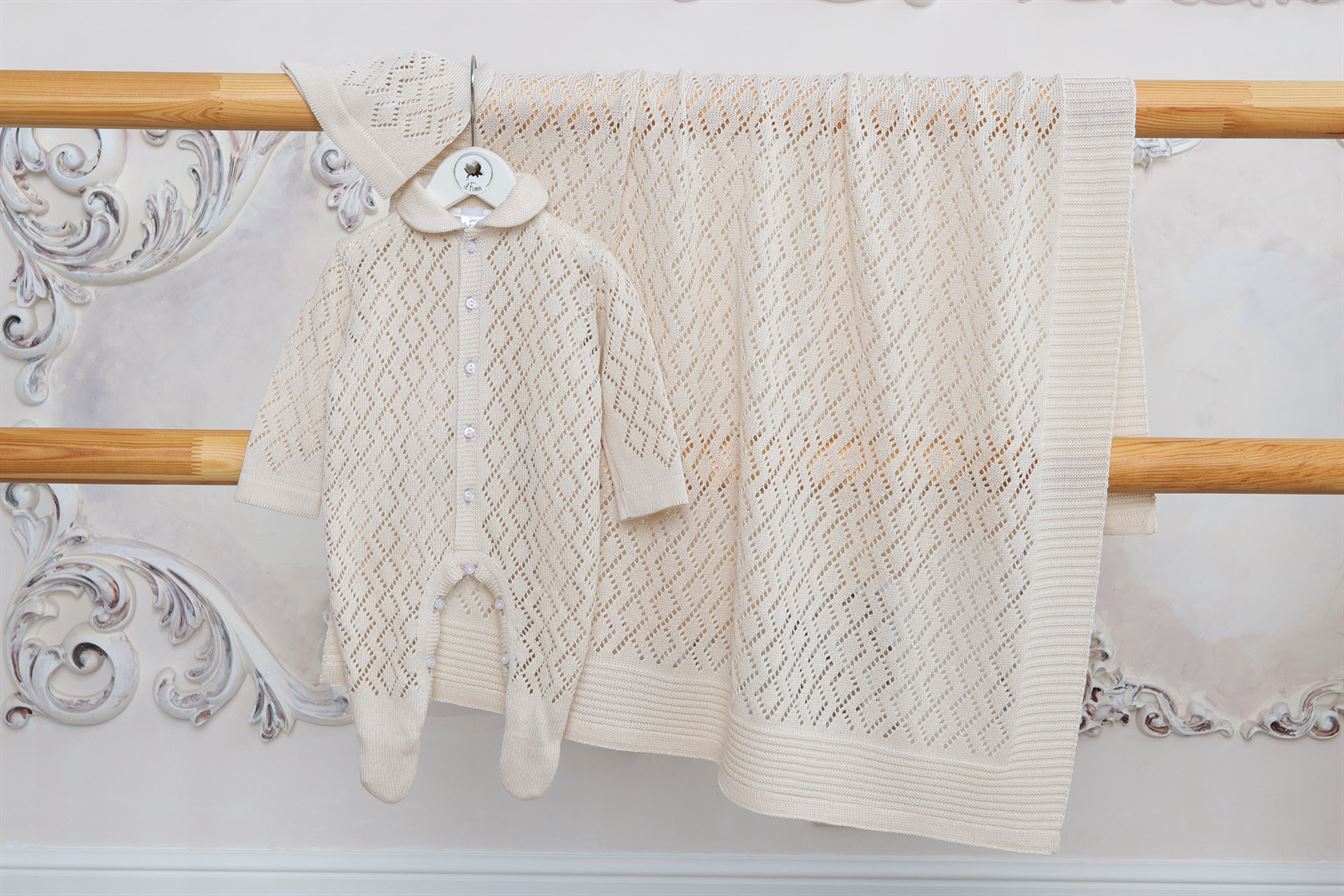 Состоит из трех предметов: плед, комбинезон и шапочка.