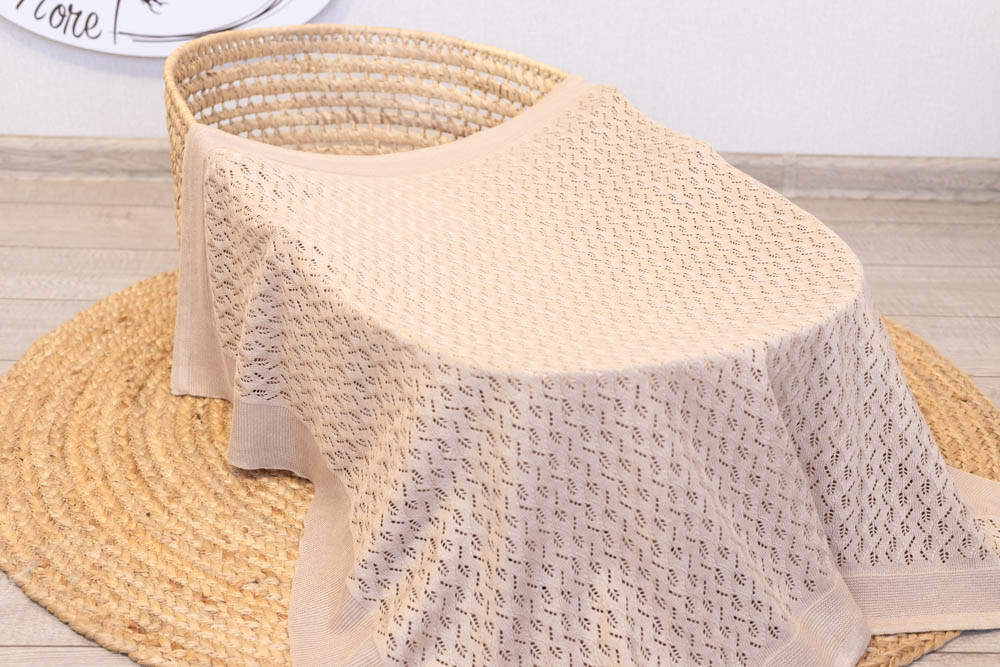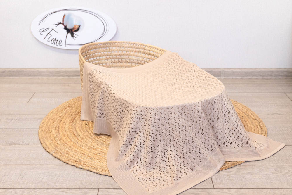 Легкий воздушный плед с оригинальным ажурным плетением подойдет, как для выписки малыша, так и для повседневного использования в коляске или люльке.