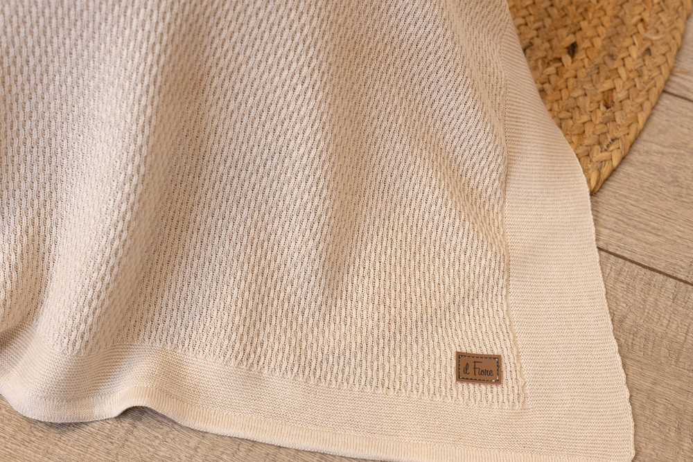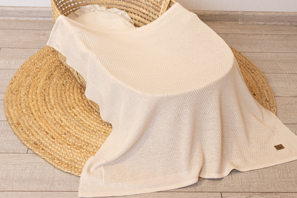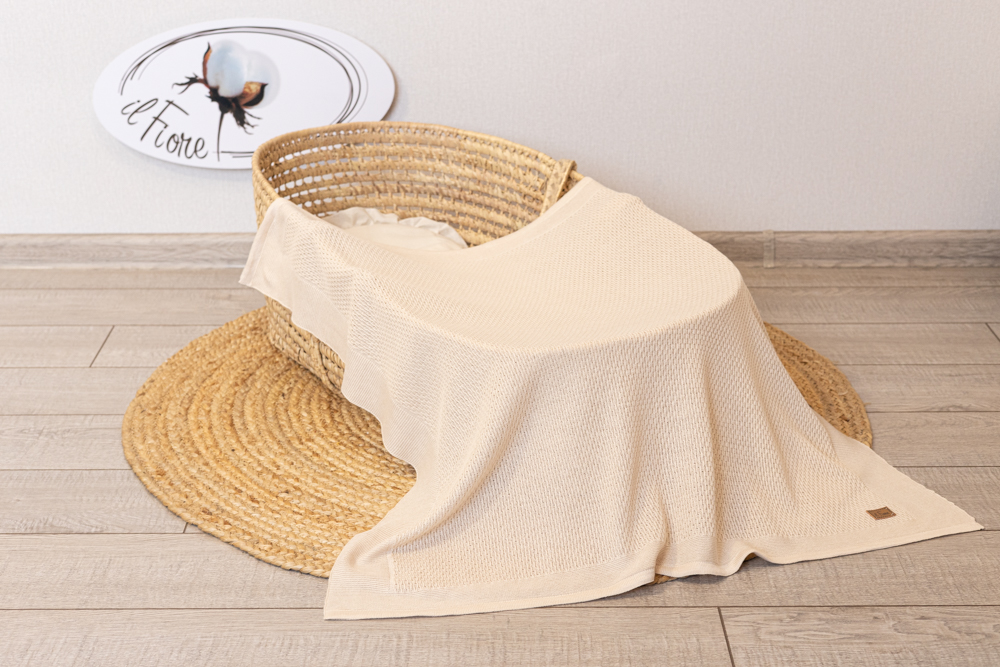 Тонкий невесомый плед с оригинальным ажурным плетением подойдет, как для выписки малыша, так и для повседневного использования в коляске или люльке.