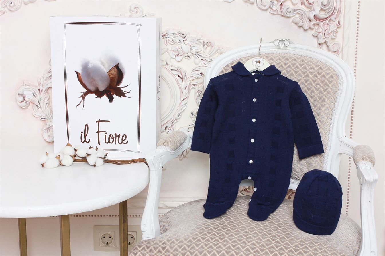 Комплект состоит из четырех предметов: конверт с бантом-резиночкой, комбинезон и шапочка.