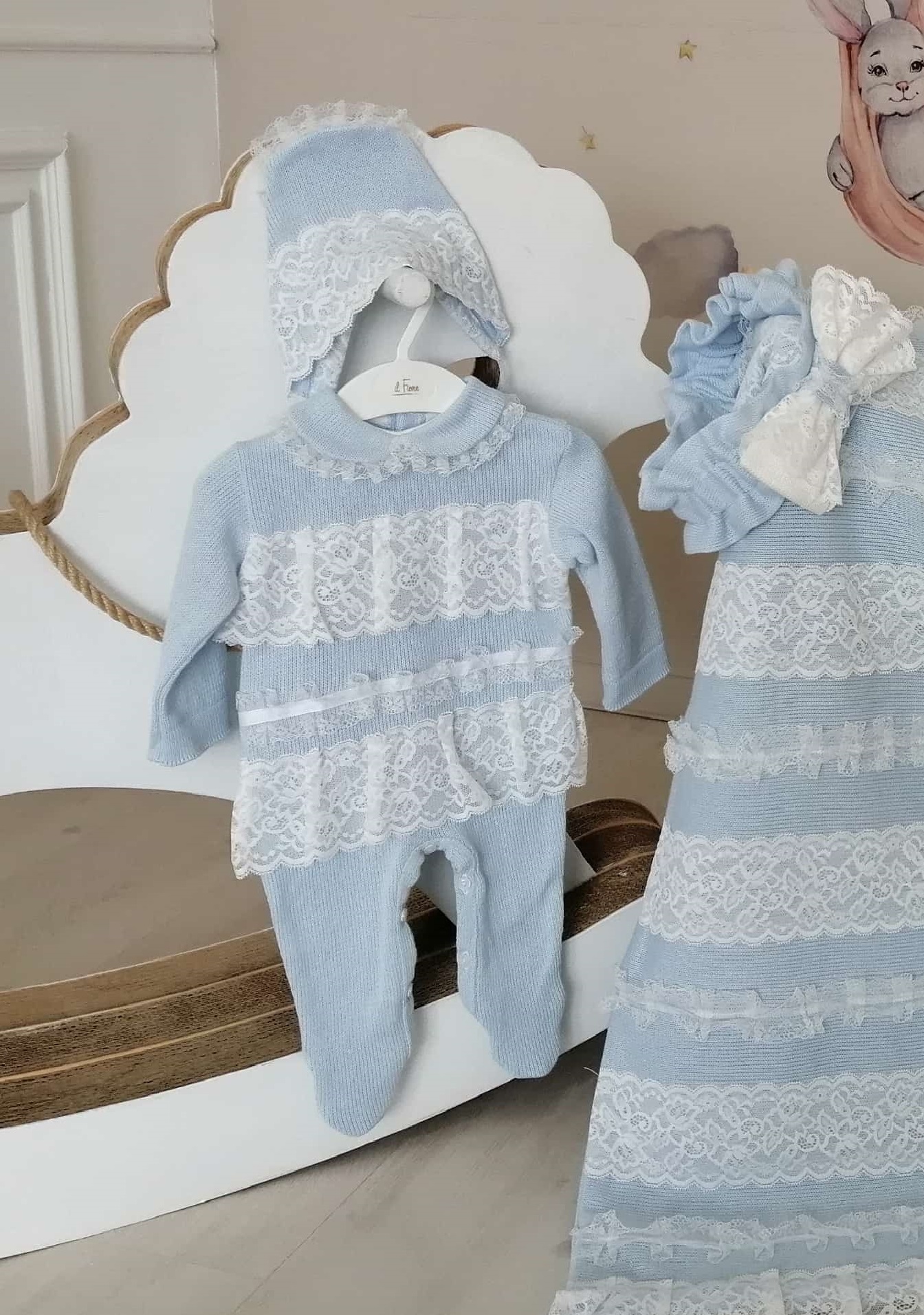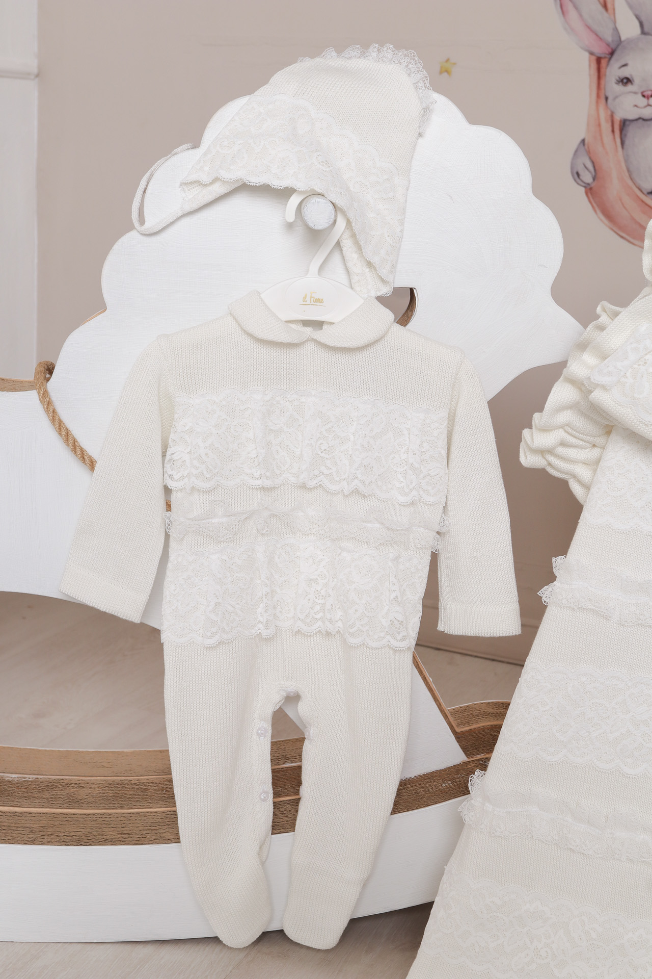 Комбинезон с чепчиком из коллекции "Мечта" - воздушное кружево, нежные тона и весенняя легкость.