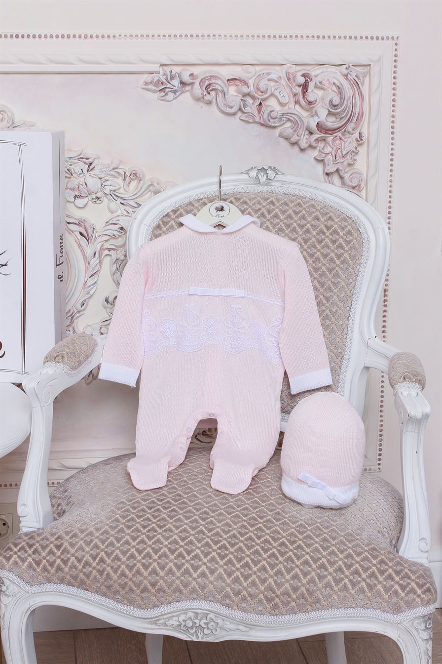 Комбинезон с шапочкой из коллекции "Роскошь", украшен нежным кружевом и бантиком.