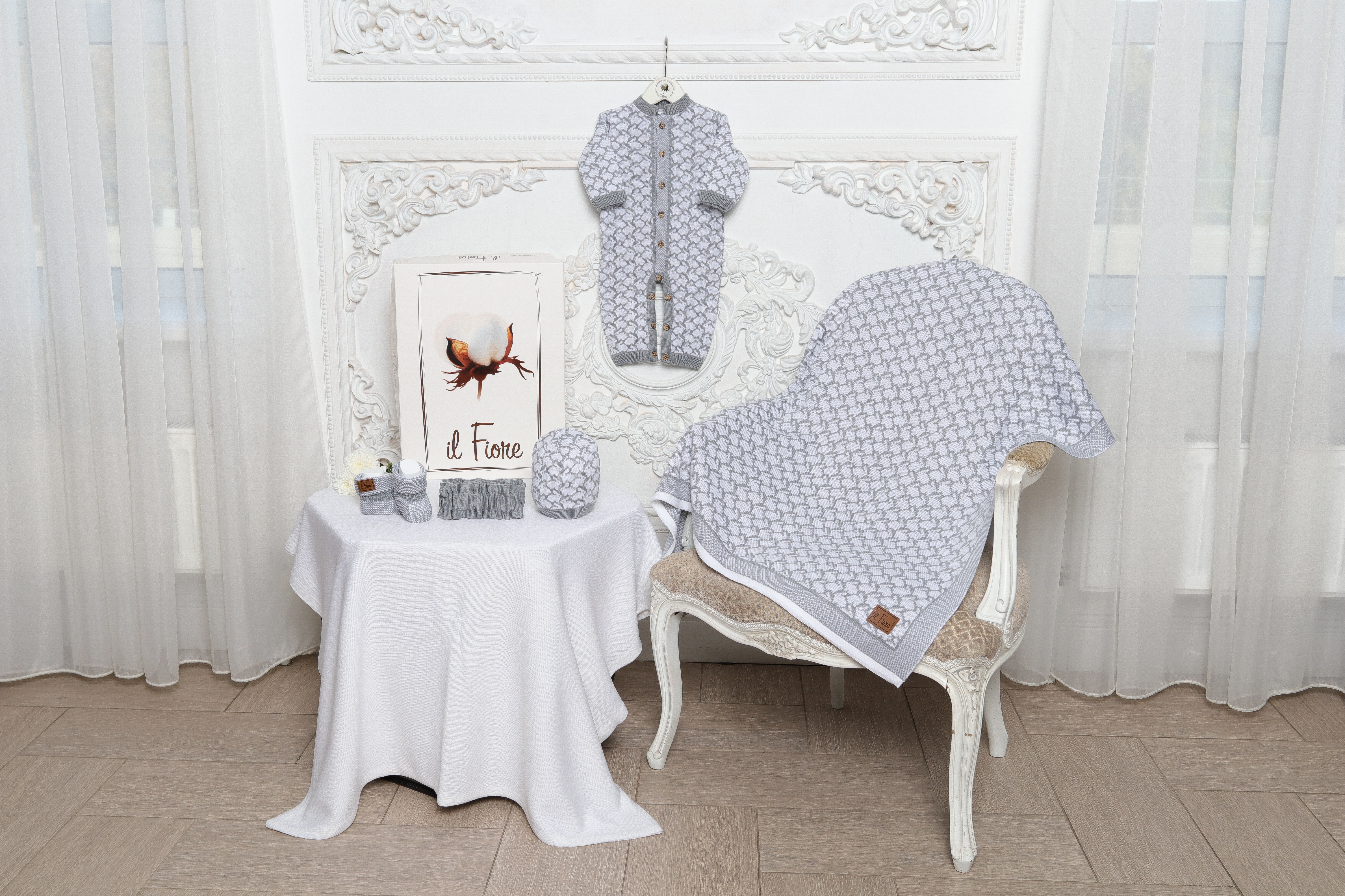 Комплект состоит из четырех предметов: плед, бант-резиночка, с помощью которого плед удобно закрепить в конверт, и комбинезон с шапочкой.