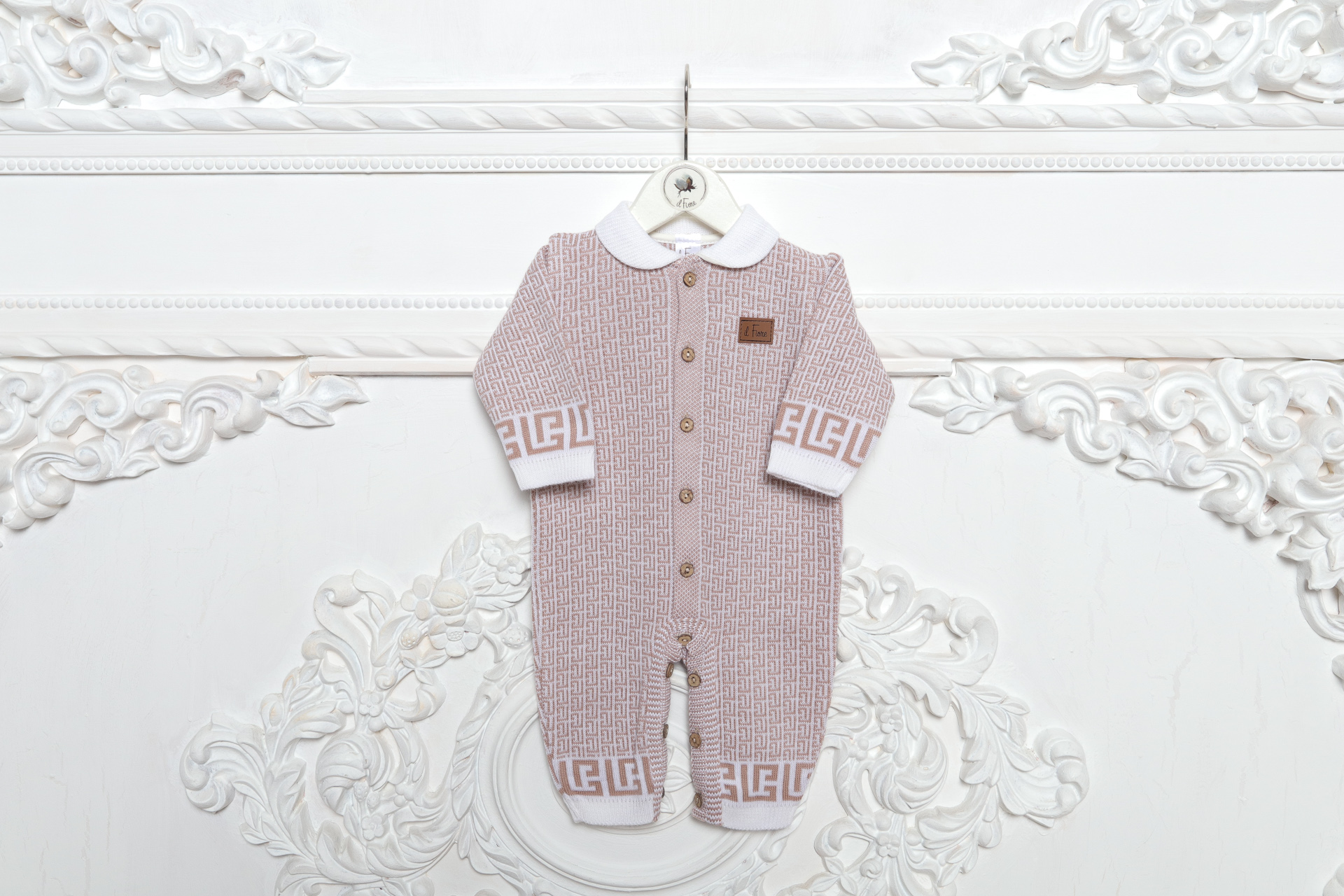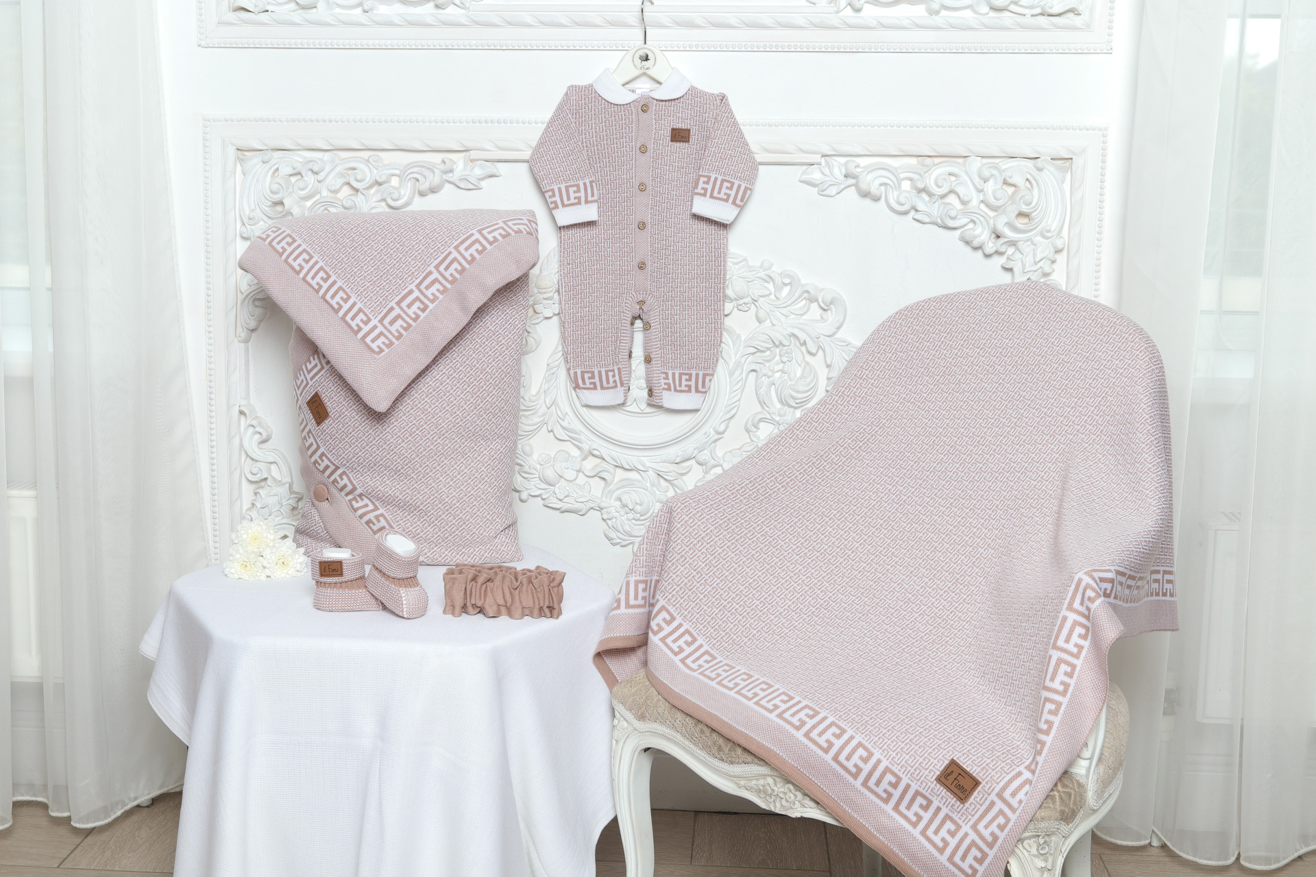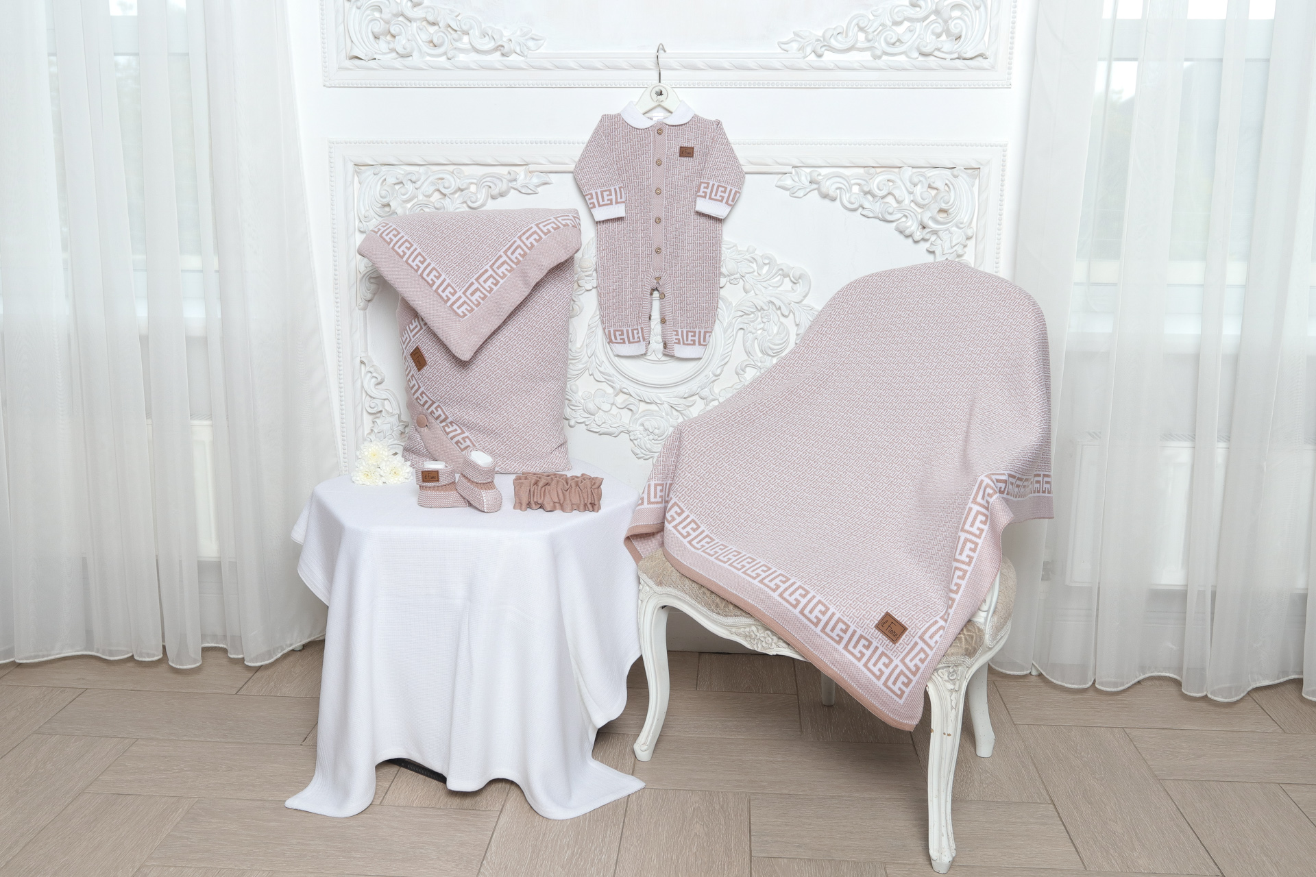 Утончённый узор придаёт каждому элементу неповторимую изысканность, делая образ малыша по-настоящему особенным. Благородные линии и изящные переплетения создают впечатление ручной работы, превращая обычный комплект в произведение искусства.