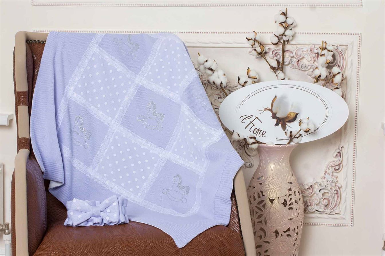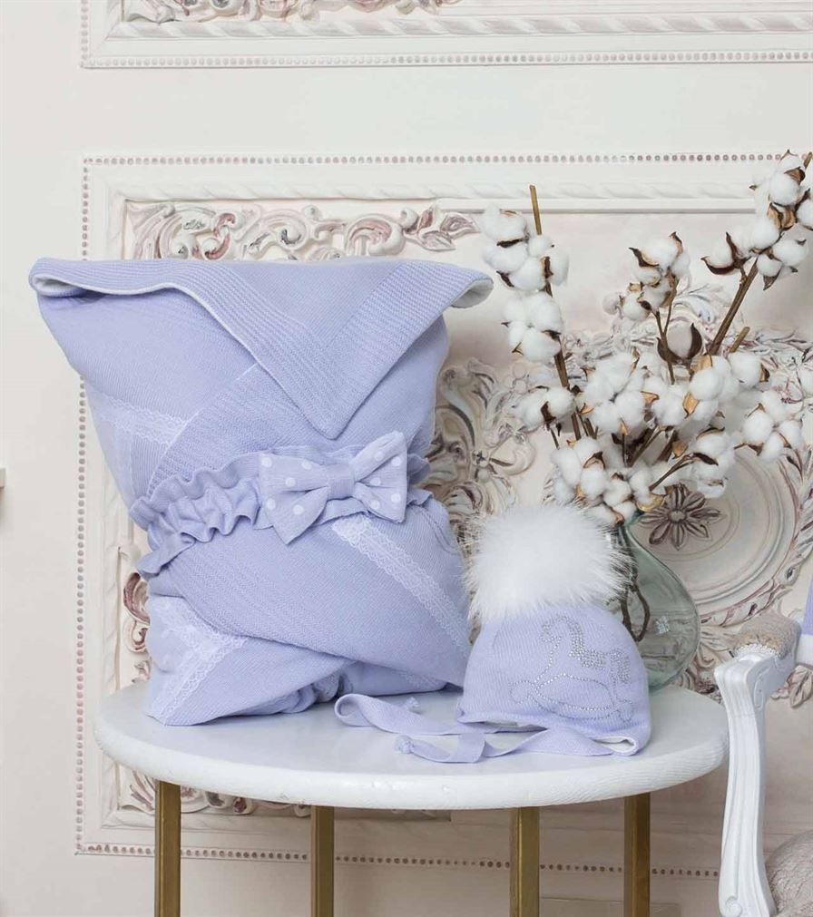 Комплект представлен в широкой гамме цветов и состоит из четырех предметов: плед, который при помощи банта-резиночки превращается в конверт, комбинезон и шапочка.
