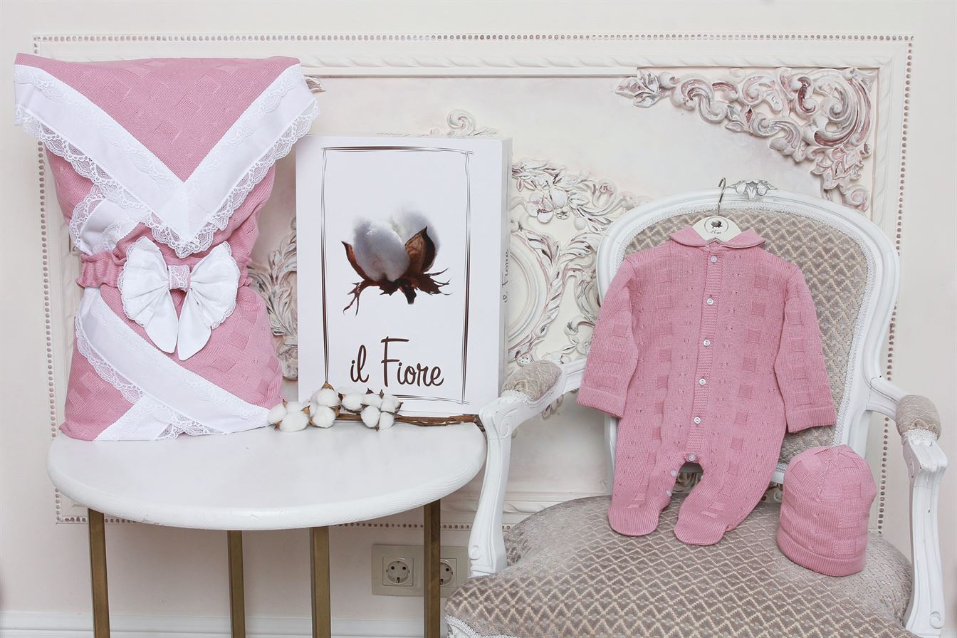 Комплект "Марсель" с фактурным плетением, с отделкой из кружева и сатина, которым полностью отделан конверт с внутренней стороны, что позволяет обойтись без уголка при выписки.