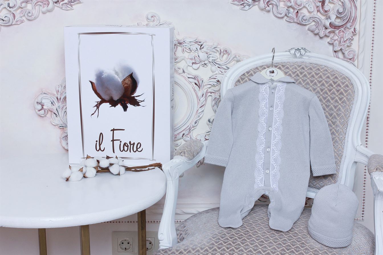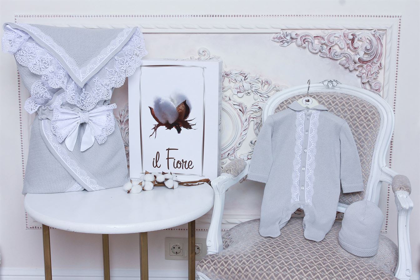 Комплект состоит из пяти предметов: конверт с бантом-резиночкой, комбинезон, шапочка и нарядный уголок, цвет которого можно выбрать - белоснежный или в цвет конверта.