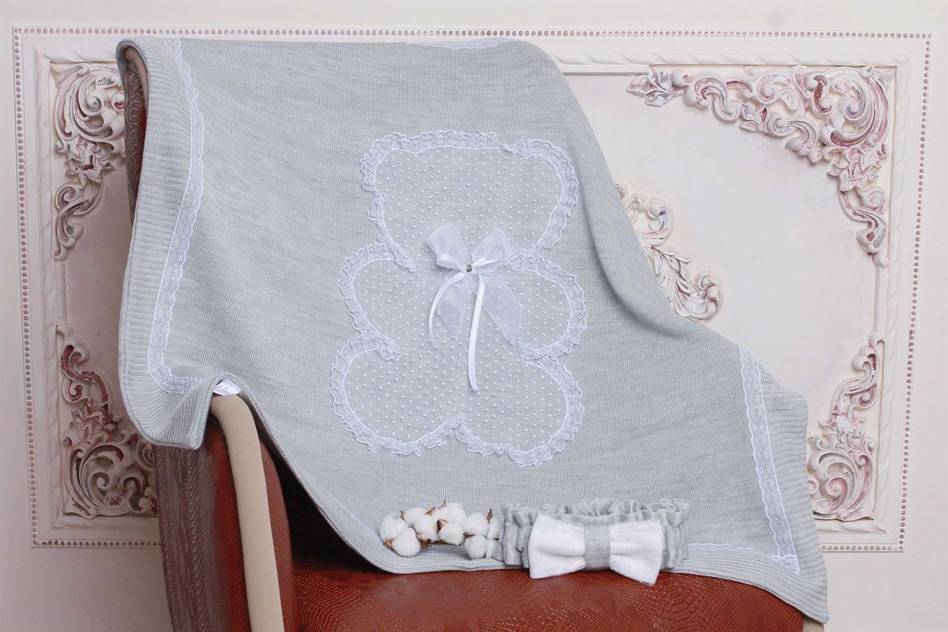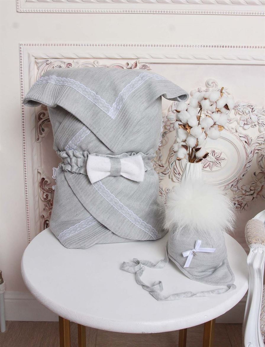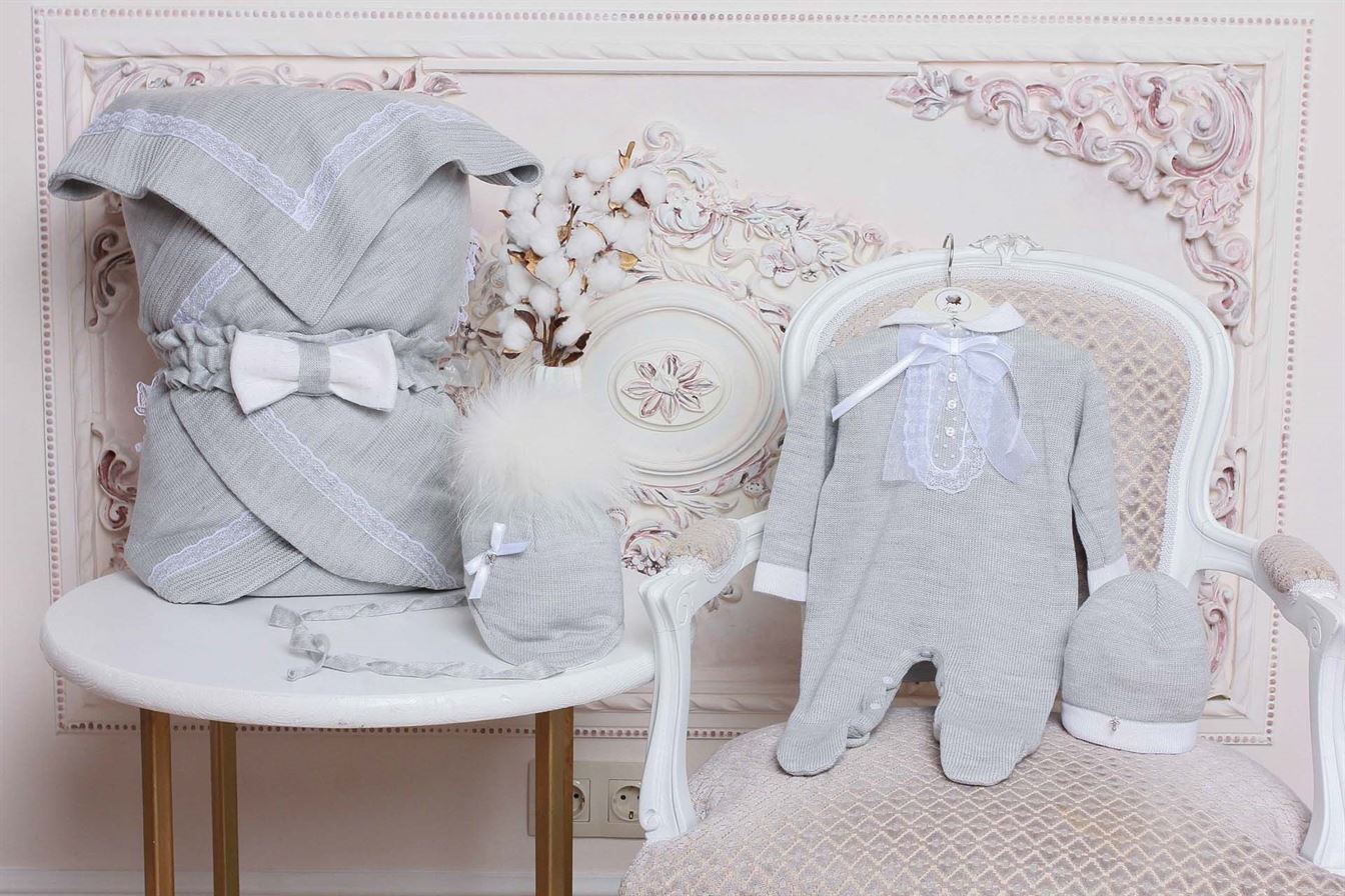 Комплект состоит из четырех предметов: плед, который при помощи банта-резиночки превращается в конверт, комбинезон и шапочка.