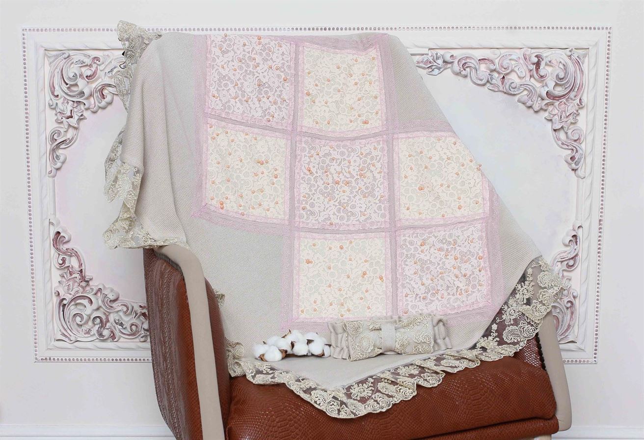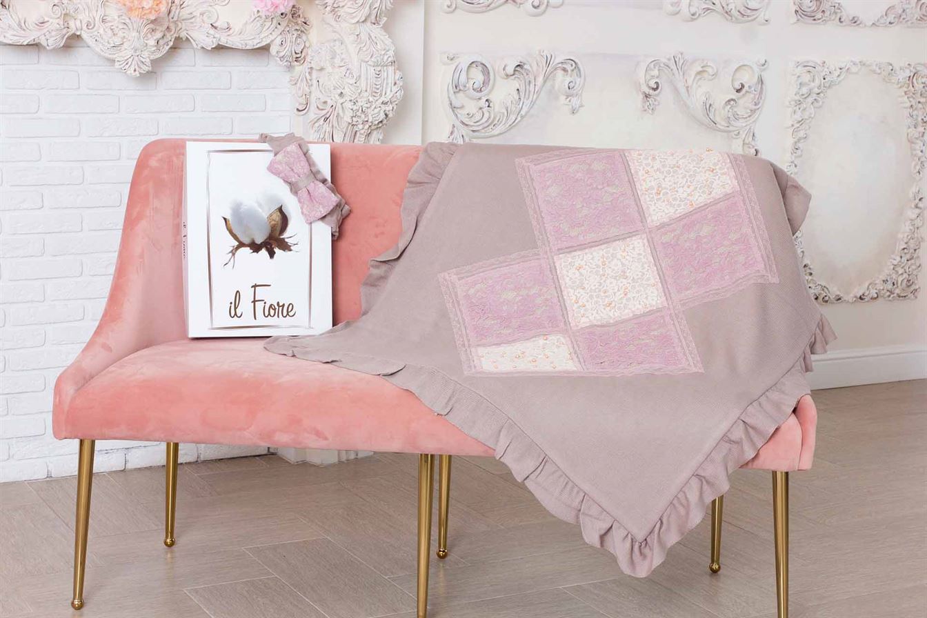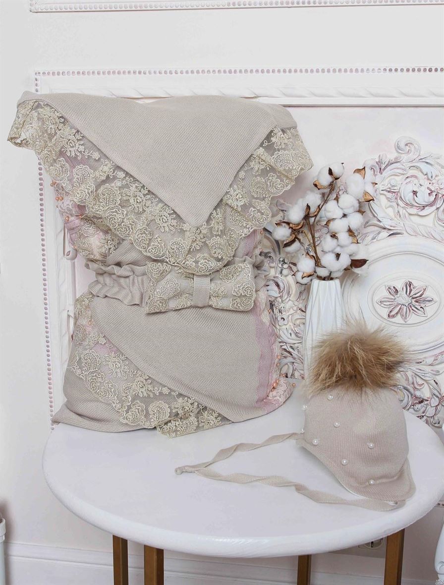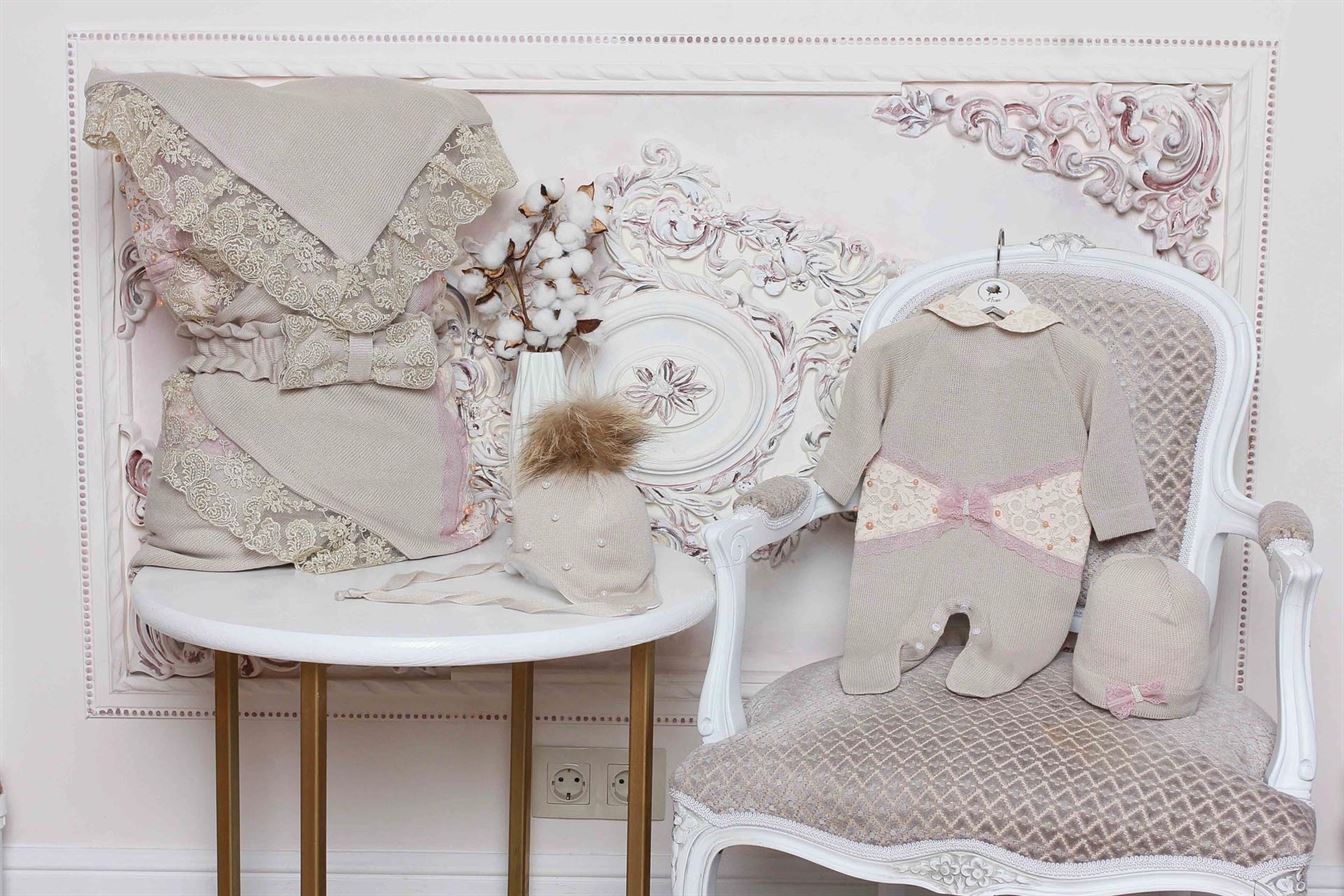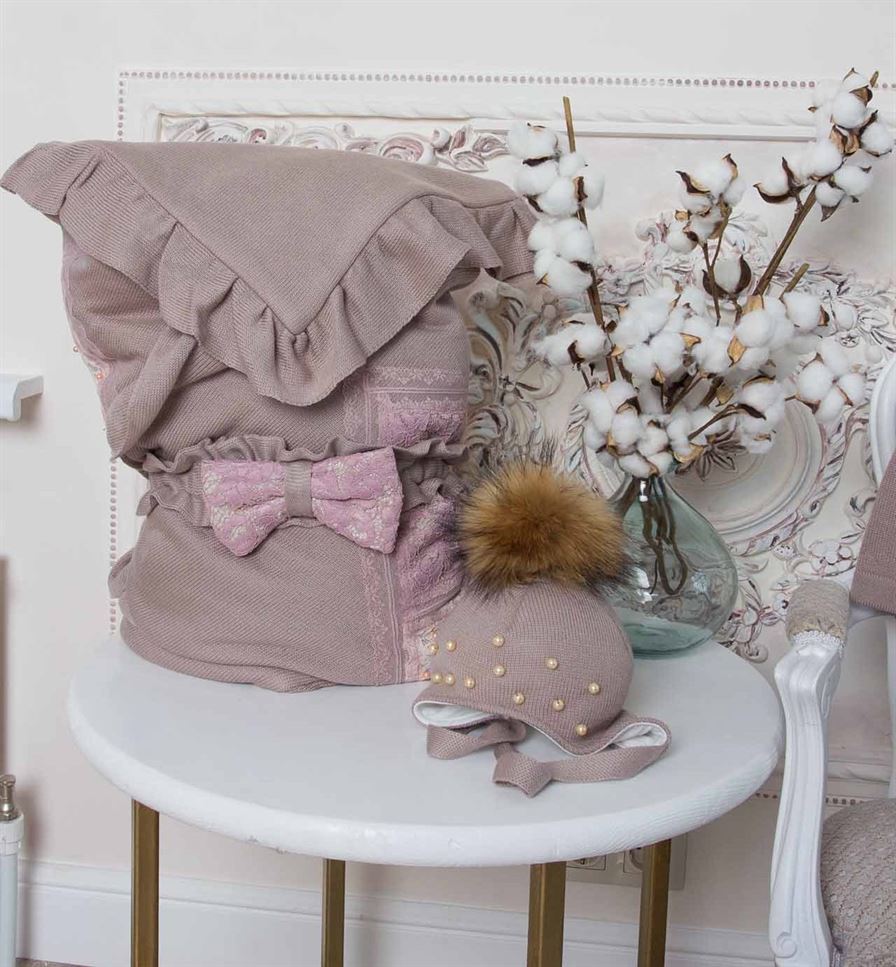 Комплект состоит из четырех предметов: плед, который при помощи банта-резиночки превращается в конверт, комбинезон и шапочка.