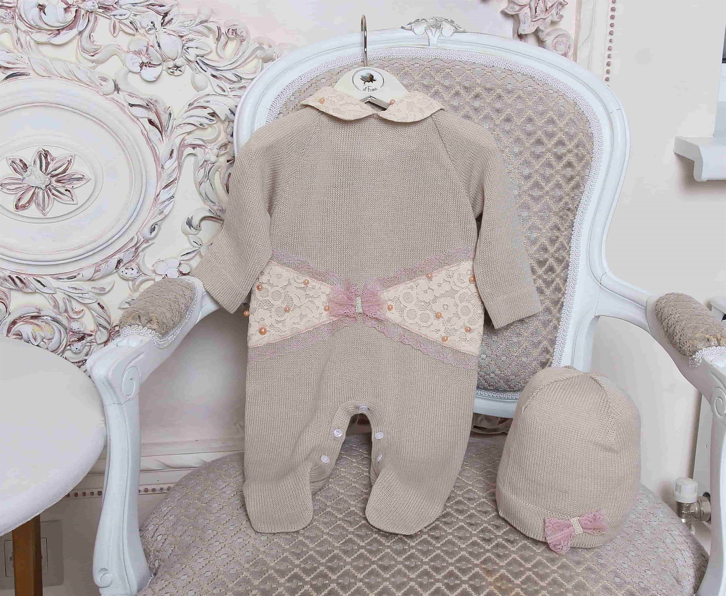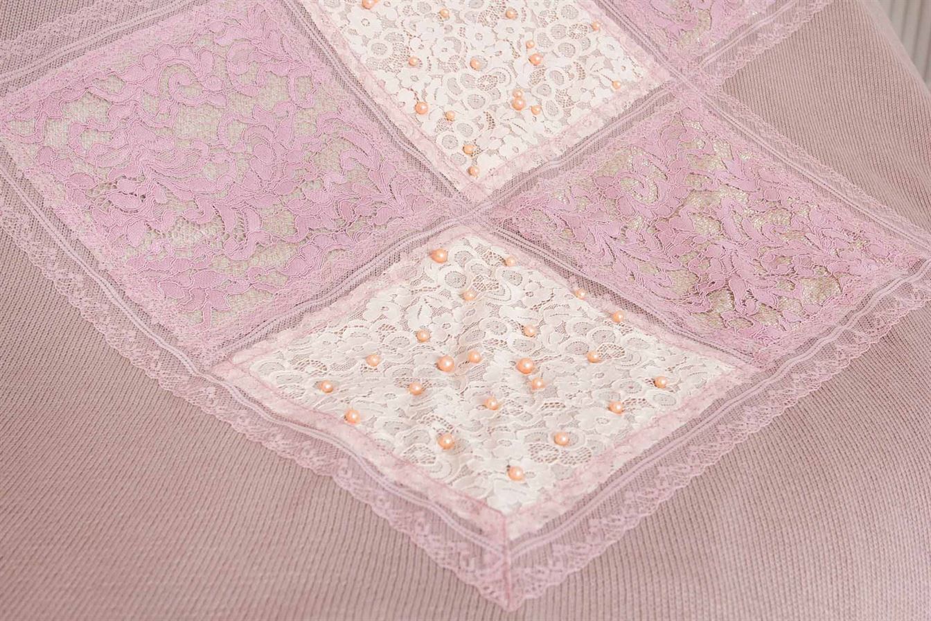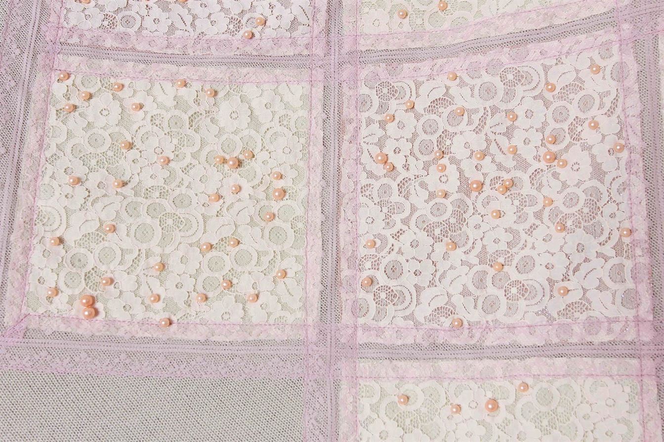 Нарядный комплект с аппликацией из ажурного кружева с жемчужными бусами.