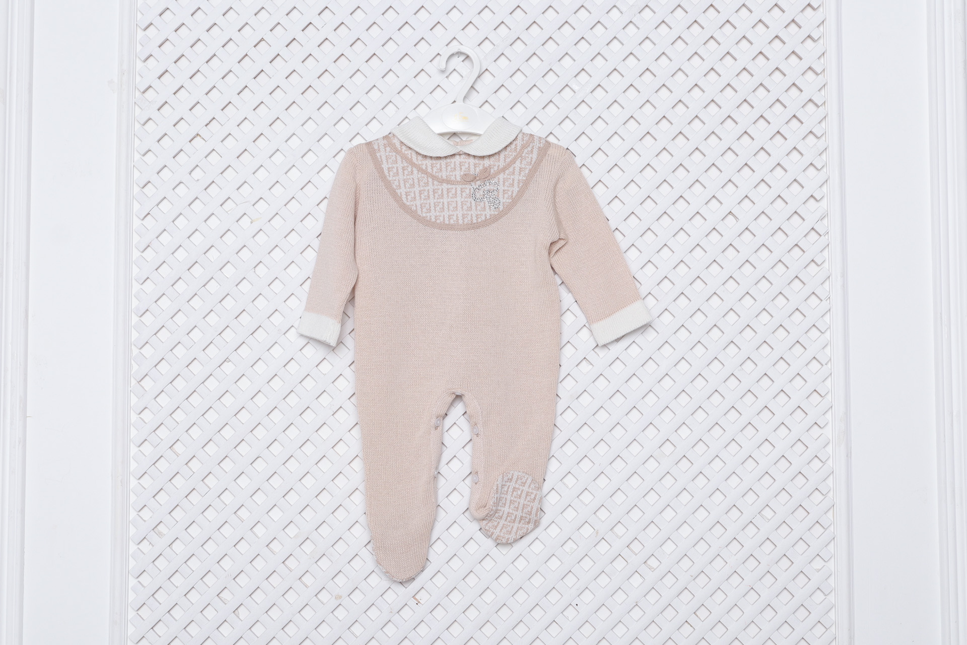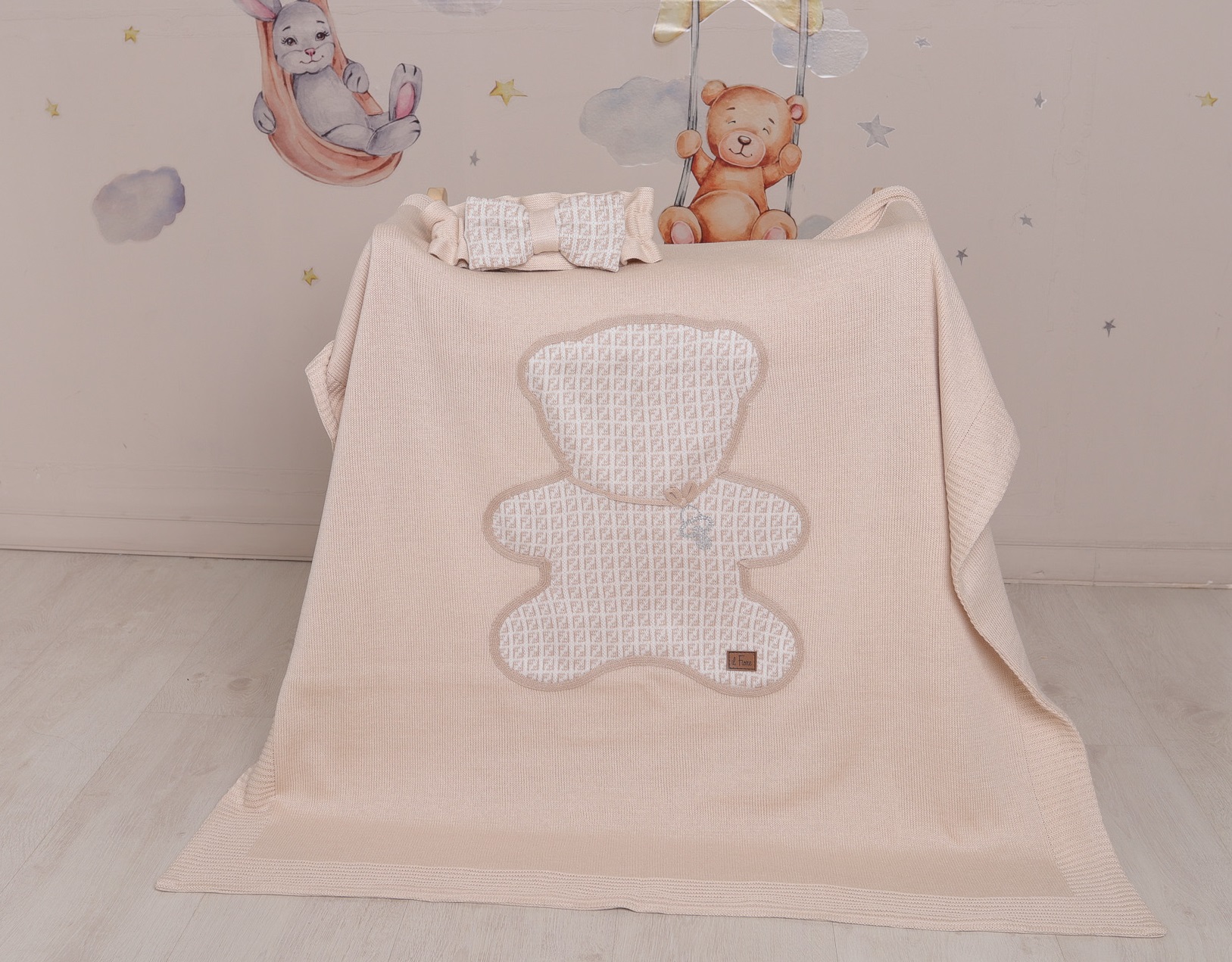 Комплект состоит из четырех предметов: плед, бант-резиночка, с помощью которого плед удобно закрепить в конверт, и комбинезон с шапочкой.