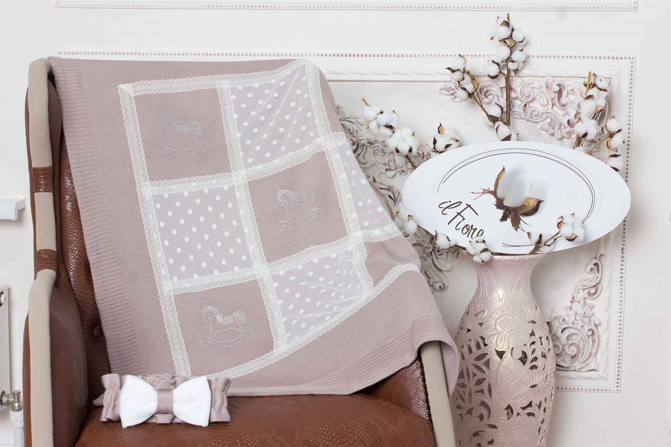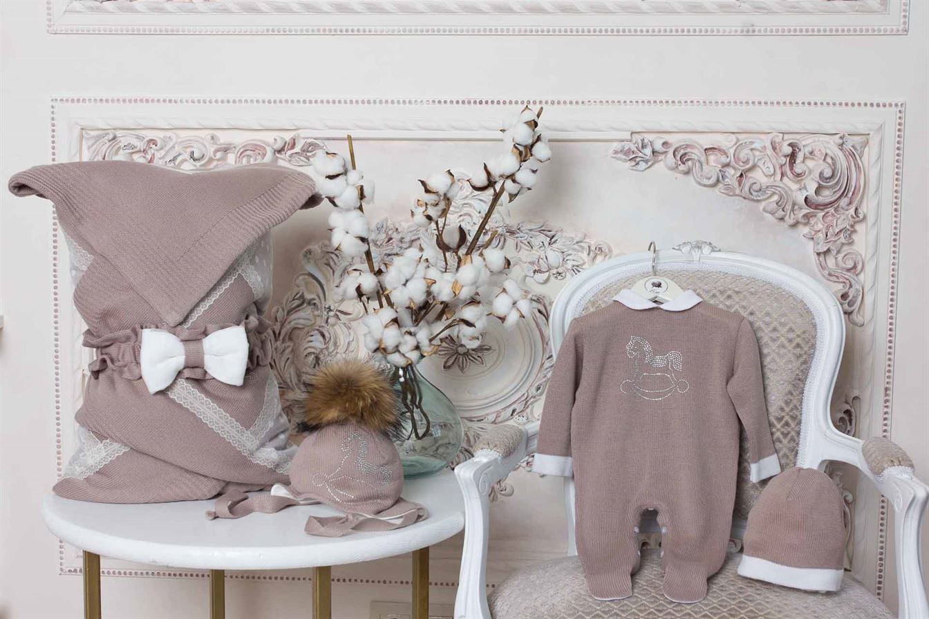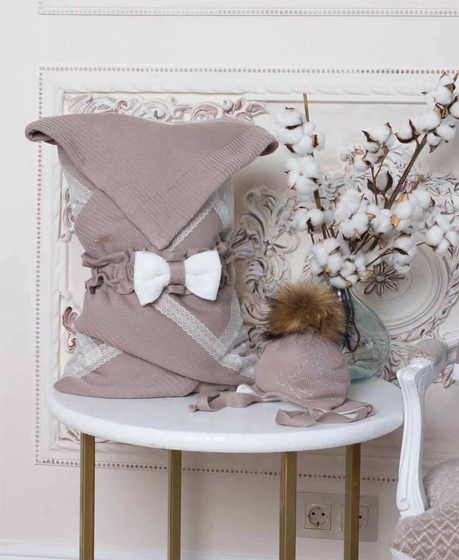 Комплект представлен в широкой гамме цветов и состоит из четырех предметов: плед, который при помощи банта-резиночки превращается в конверт, комбинезон и шапочка.