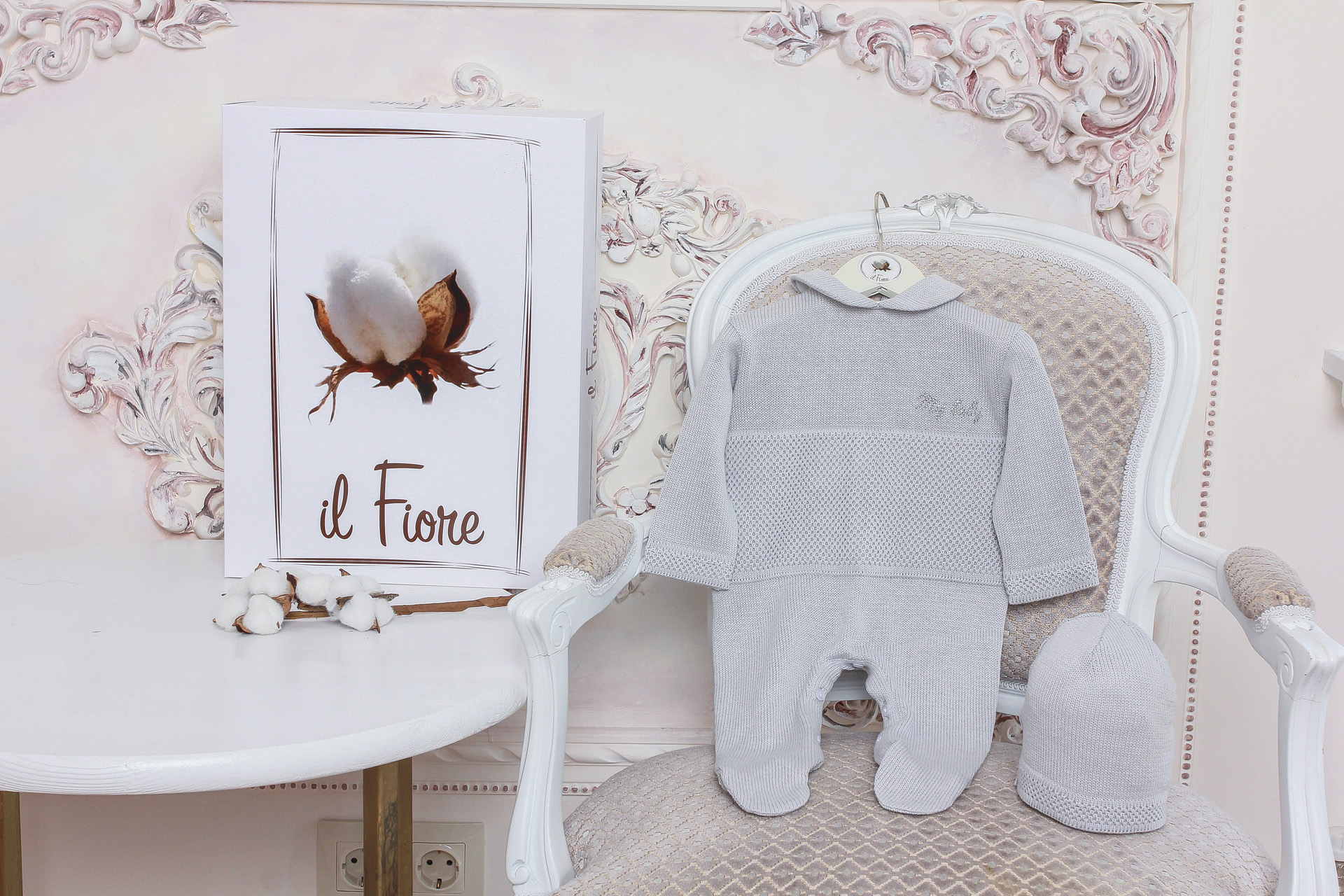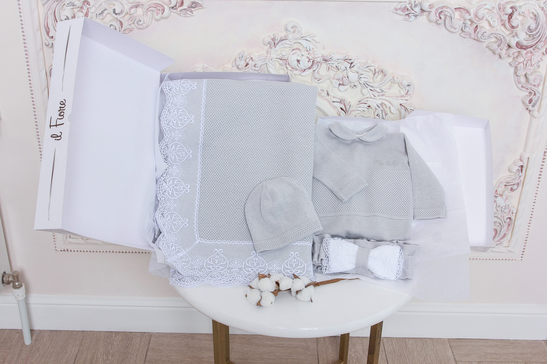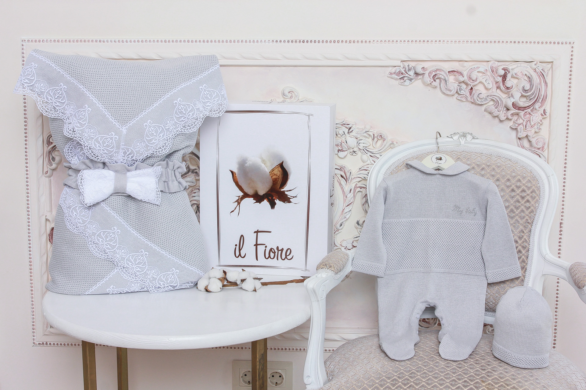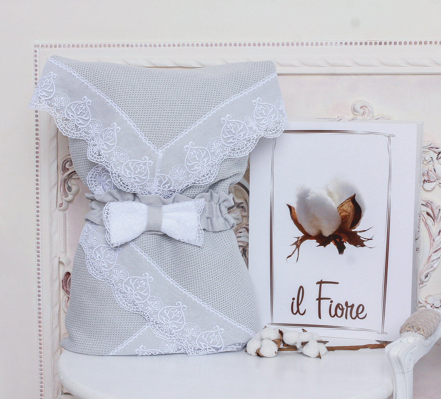 Комплект состоит из четырех предметов: плед, который при помощи банта-резиночки превращается в конверт, комбинезон и шапочка.
