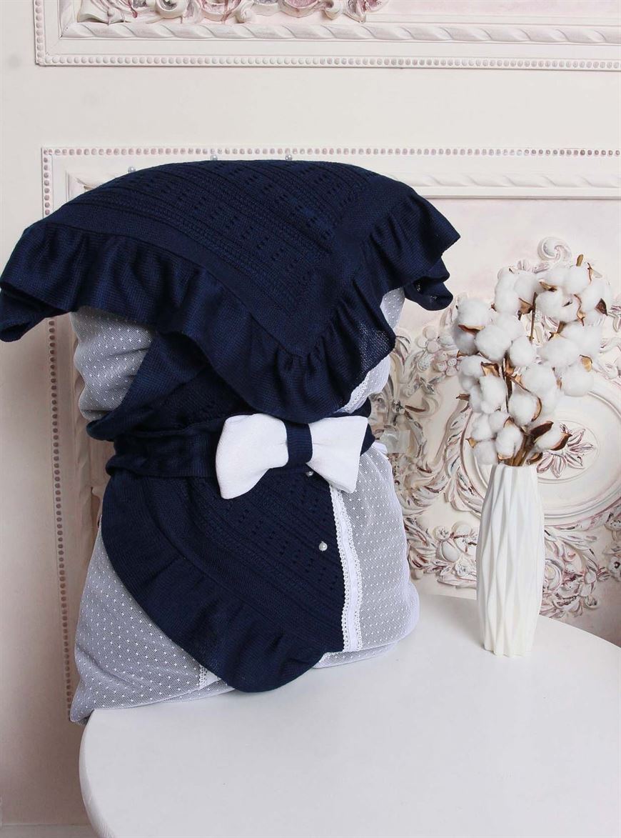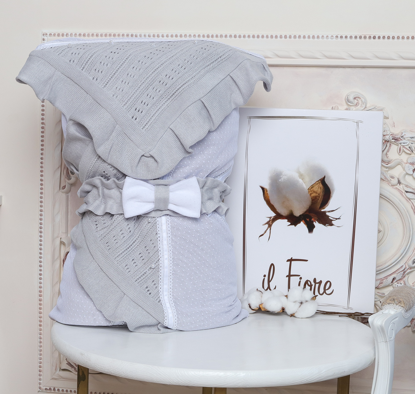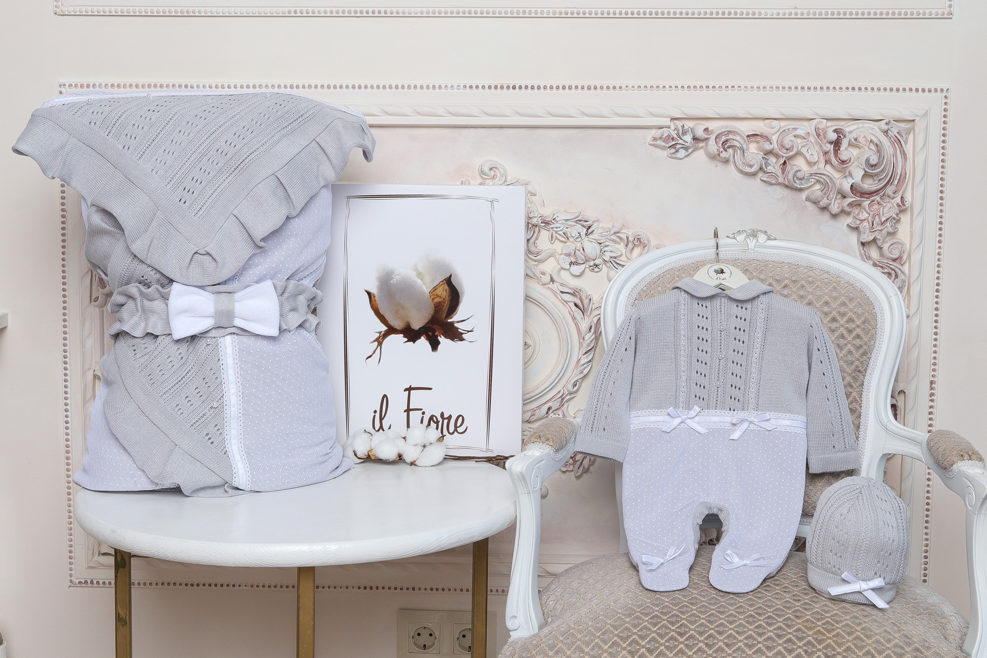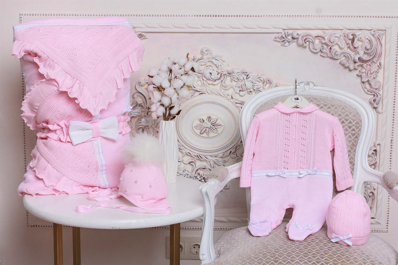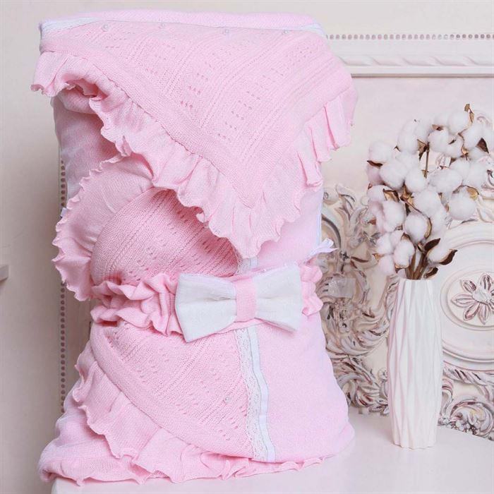 Комплект состоит из четырех предметов: плед, который при помощи банта-резиночки превращается в конверт, комбинезон и шапочка.