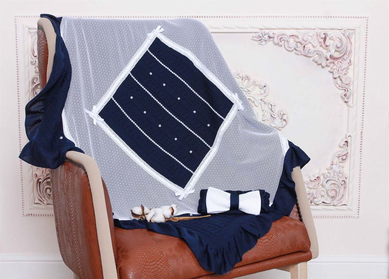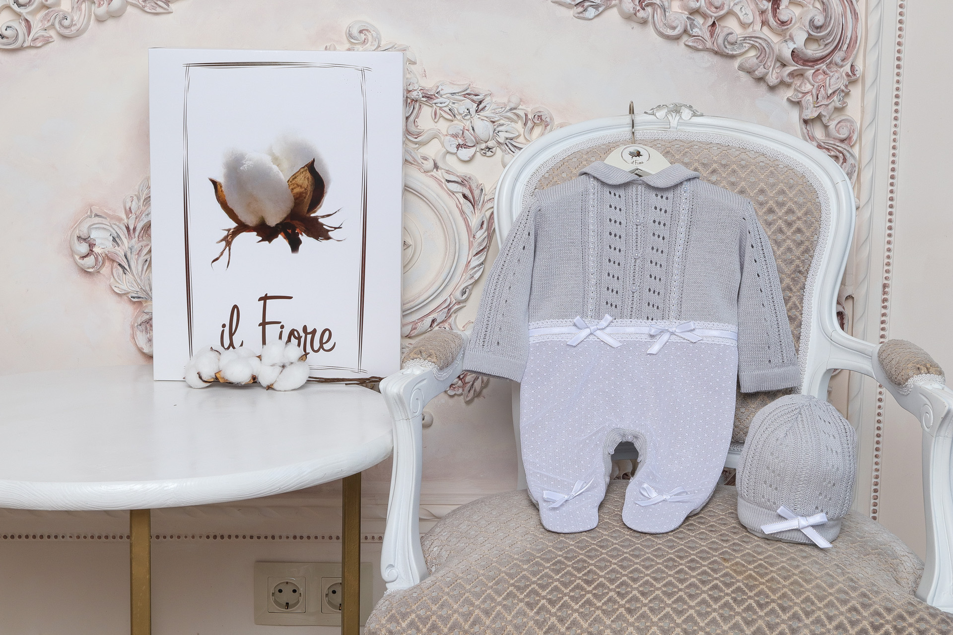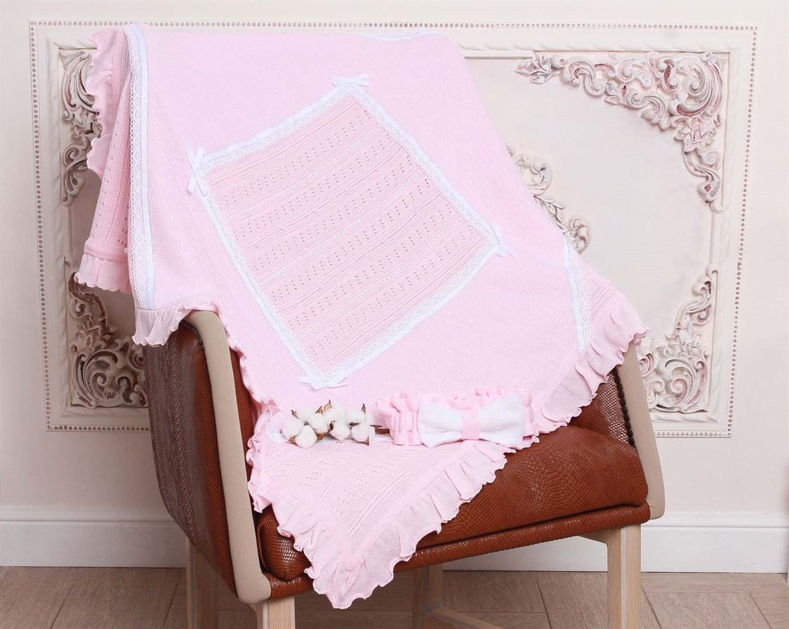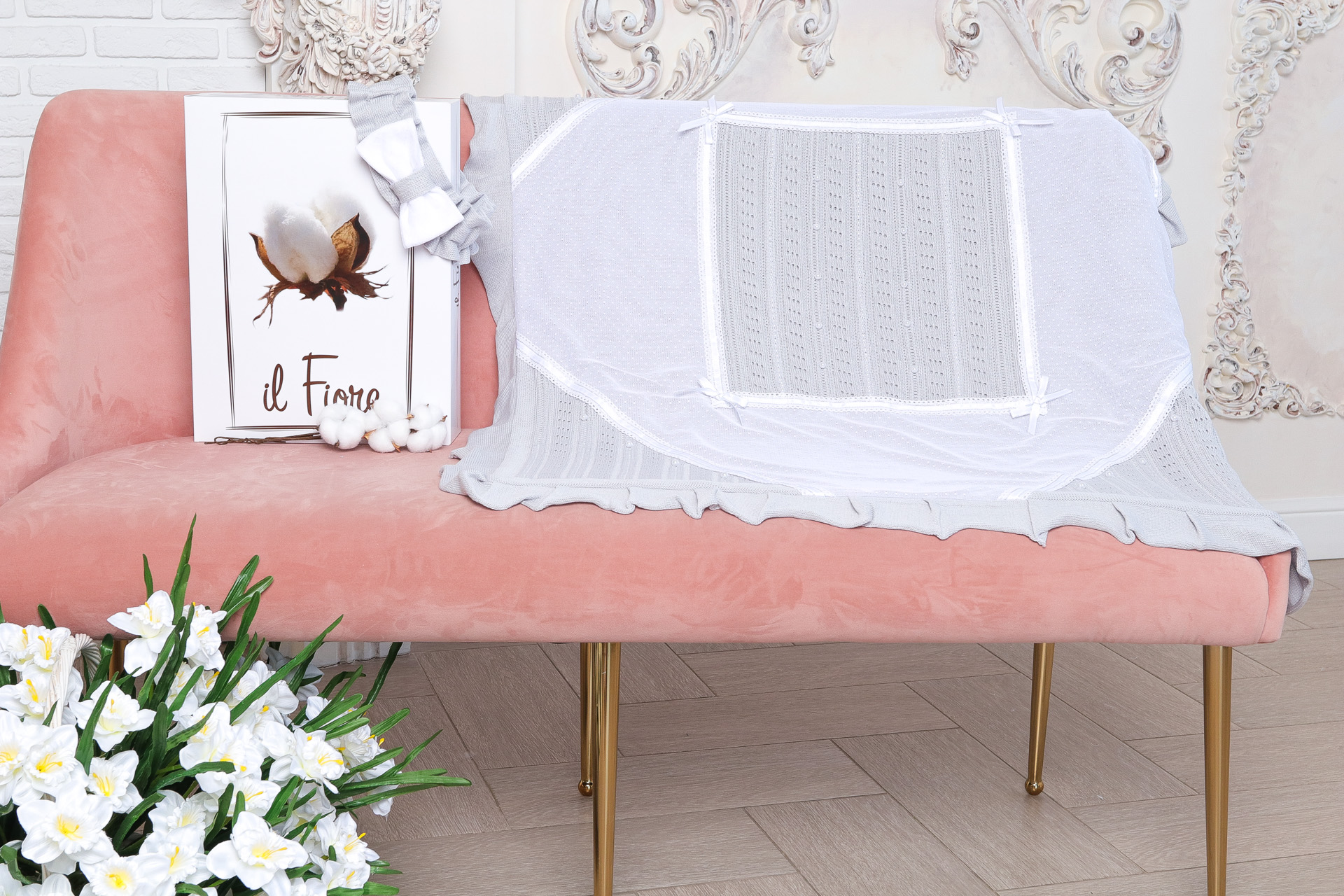 Комплект состоит из четырех предметов: плед, который при помощи банта-резиночки превращается в конверт, комбинезон и шапочка.