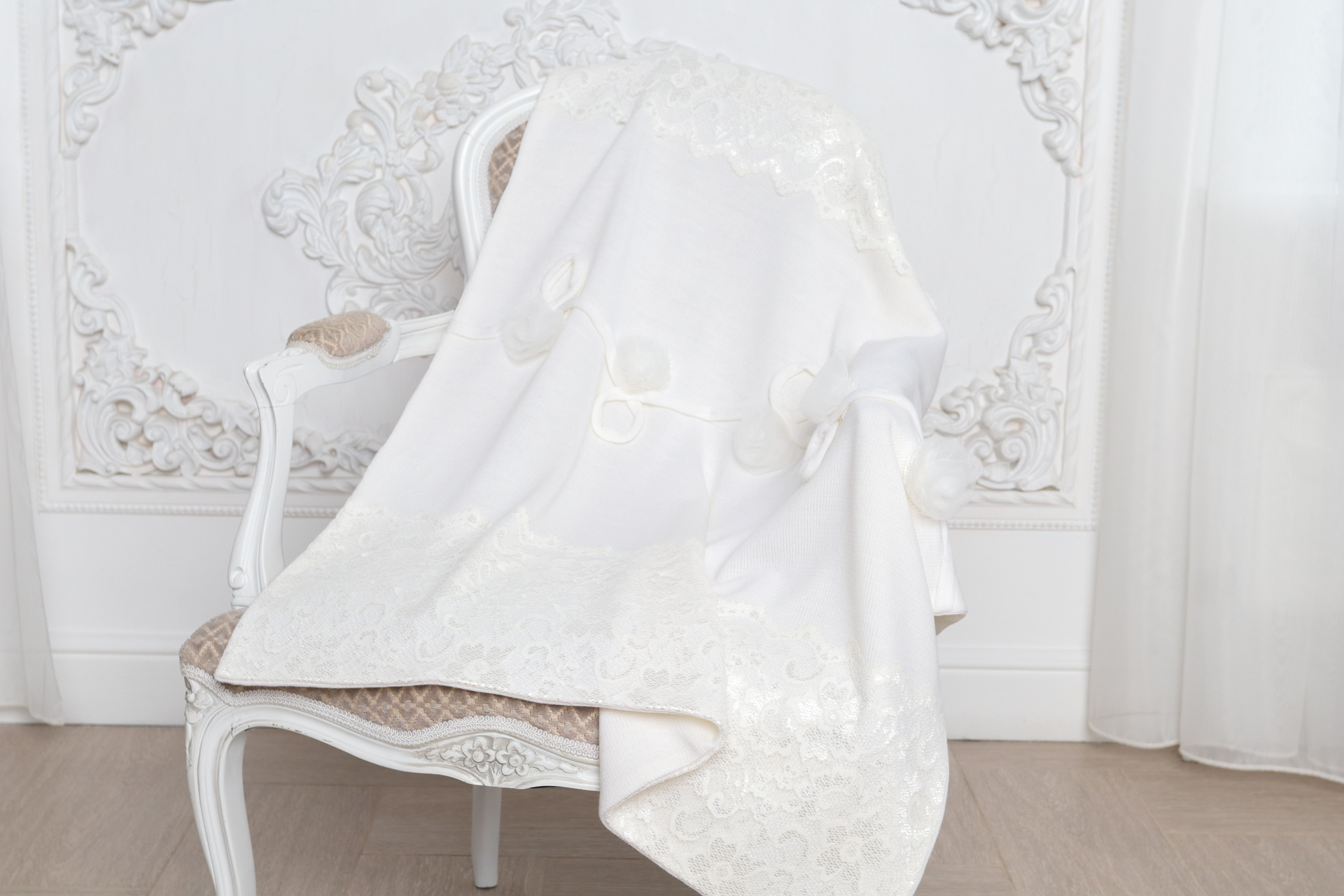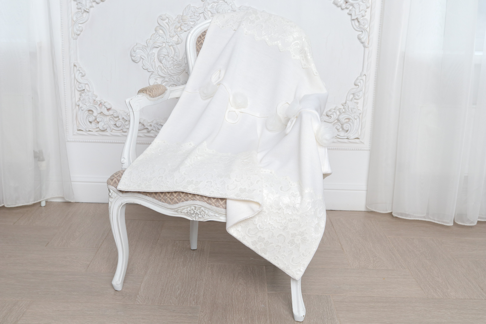 Роскошный плед с отделкой из утонченного атласного кружева и легких, воздушных цветков прекрасно подойдет для выписки малыша из роддома и других торжественных случаев.