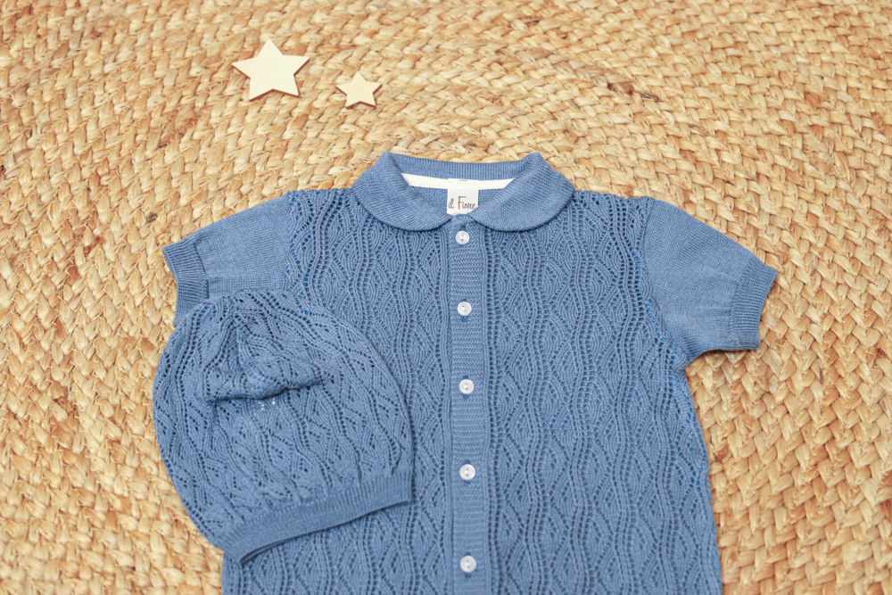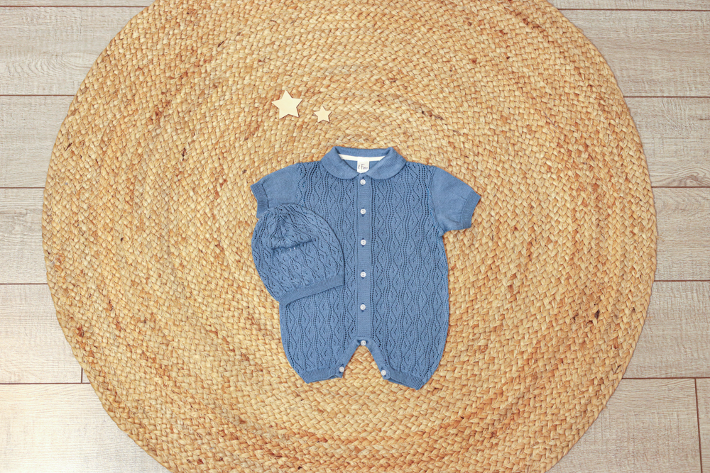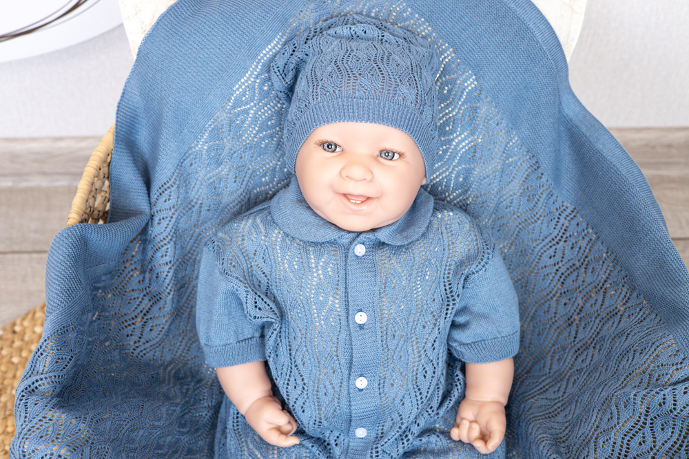 Тонкий невесомый песочник с шапочкой в оригинальном ажурном плетении подойдет, как для выписки малыша, так и для повседневного использования на прогулке.