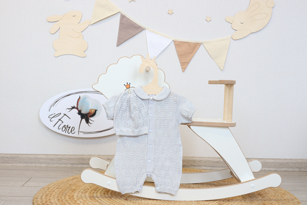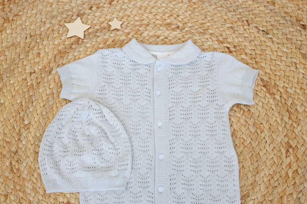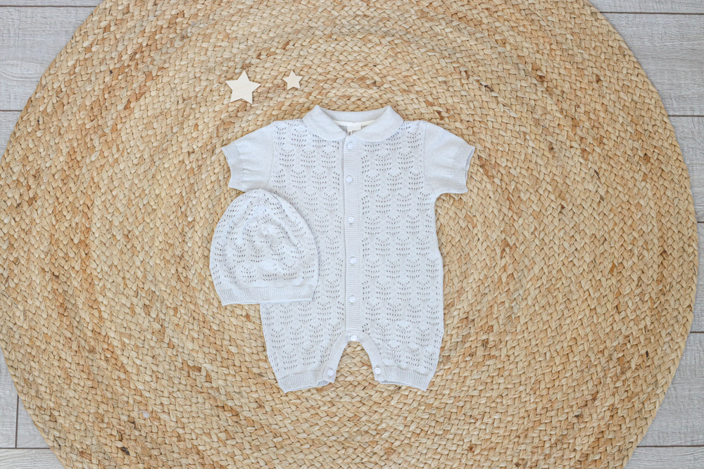 Тонкий невесомый песочник с шапочкой в оригинальном ажурном плетении подойдет, как для выписки малыша, так и для повседневного использования на прогулке.