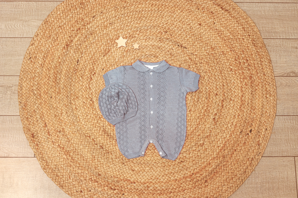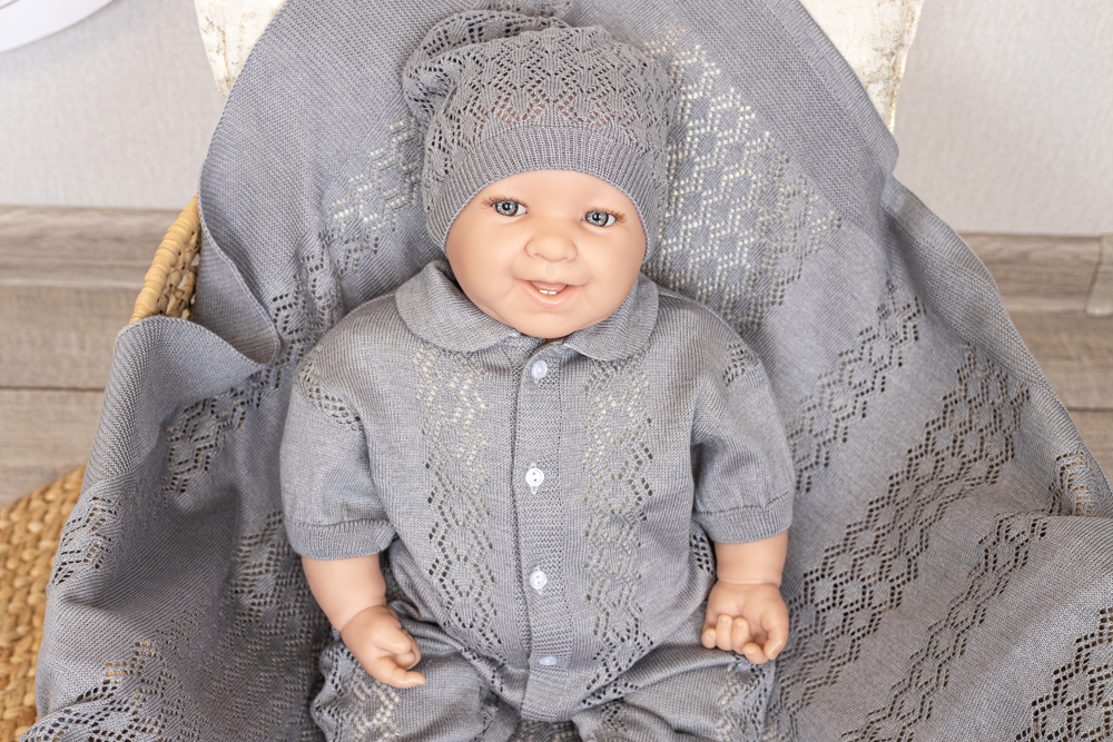Тонкий невесомый песочник с шапочкой в оригинальном ажурном плетении подойдет, как для выписки малыша, так и для повседневного использования на прогулке.