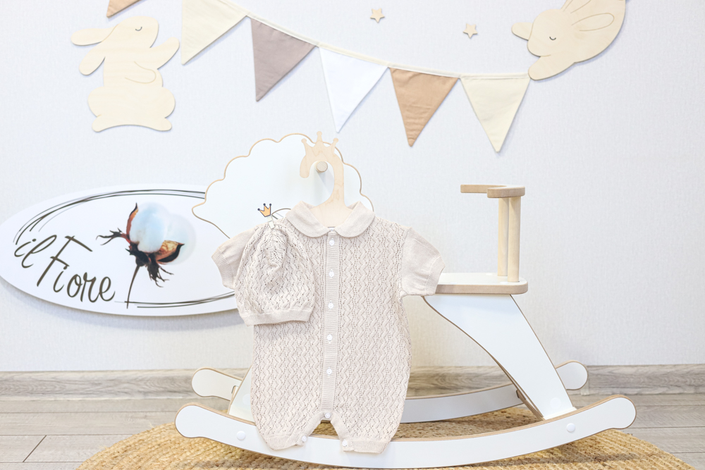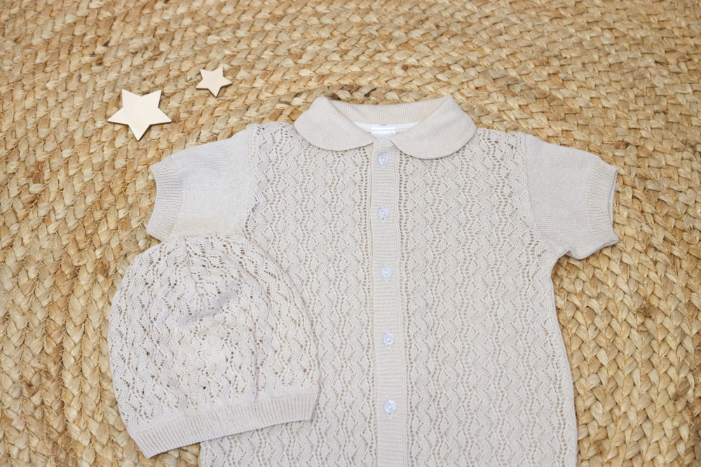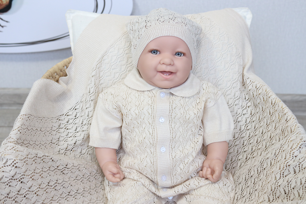 Тонкий невесомый песочник с шапочкой в оригинальном ажурном плетении подойдет, как для выписки малыша, так и для повседневного использования на прогулке.