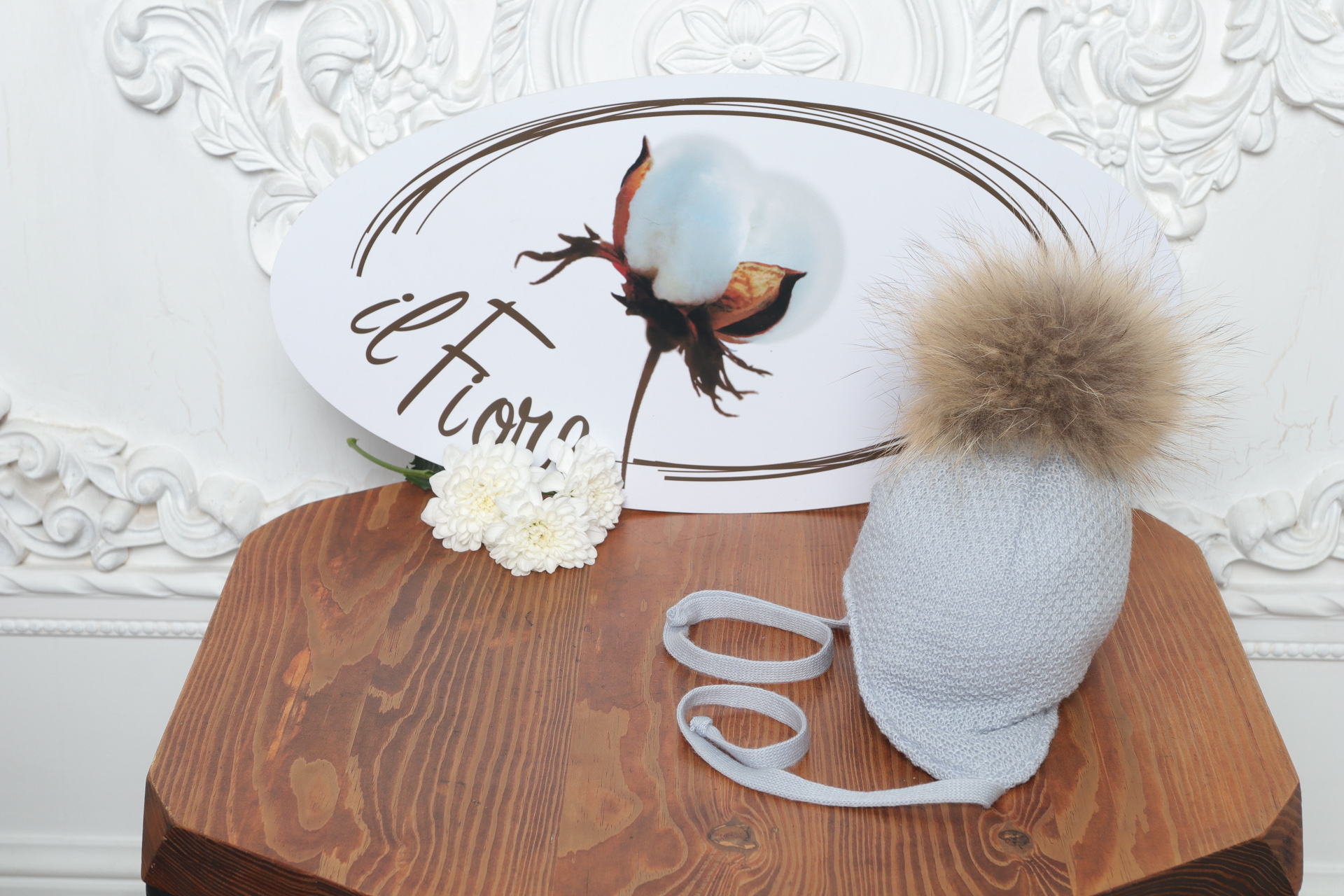 Вязаная шапочка с фактурным узором с подкладкой из 100% хлопка, утепленная изософтом и украшенная помпоном из натурального меха.